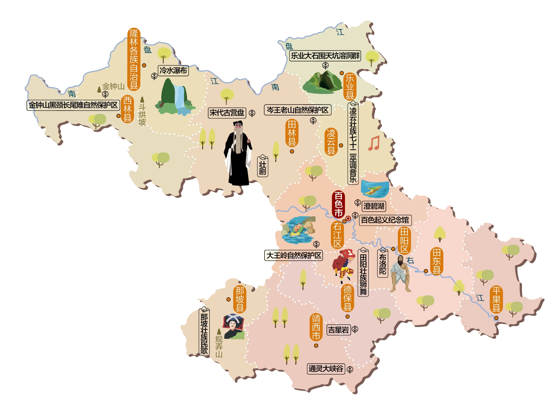 百色市,广西壮族自治区辖地级市,国家重点开发开放试验区,珠江—西江经济带重要节点城市,位于广西壮族自治区西部,右江上游,西与云南省文山州相接,北与贵州省黔西南州毗邻,东与广西壮族自治区首府南宁市紧连,南与越南接壤;地形为南北高中间低,地势走向由西北向东南倾斜,属亚热带季风气候,总面积3.63万平方千米。百色市是云、贵、桂三省区交界的交通枢纽和物资集散地,是大西南出海通道进入广西腹地的咽喉城市,具有东靠西联,承东启西的特殊区位优势;百色人文底蕴深厚,历史文化、山水生态和红色旅游资源丰富,布洛陀、北路壮剧、壮族民歌、壮族织锦技艺、壮族嘹歌、瑶族铜鼓舞、壮族狮舞被列入国家非物质文化遗产名录;百色是珠江上游重要生态安全屏障之一,也是中国面向东盟开放合作的前沿和窗口;是一个集革命老区、少数民族地区、边境地区、大石山区、水库移民区五区一体的特殊区域,是著名芒果之乡和重要的铝工业基地。百色市下辖2个市辖区、7个县、1个自治县,代管2个县级市。 市辖区:右江区、田阳区 县级市:靖西市、平果市 县:田东县、德保县、那坡县、凌云县、乐业县、田林县、西林县 自治县:隆林各族自治县