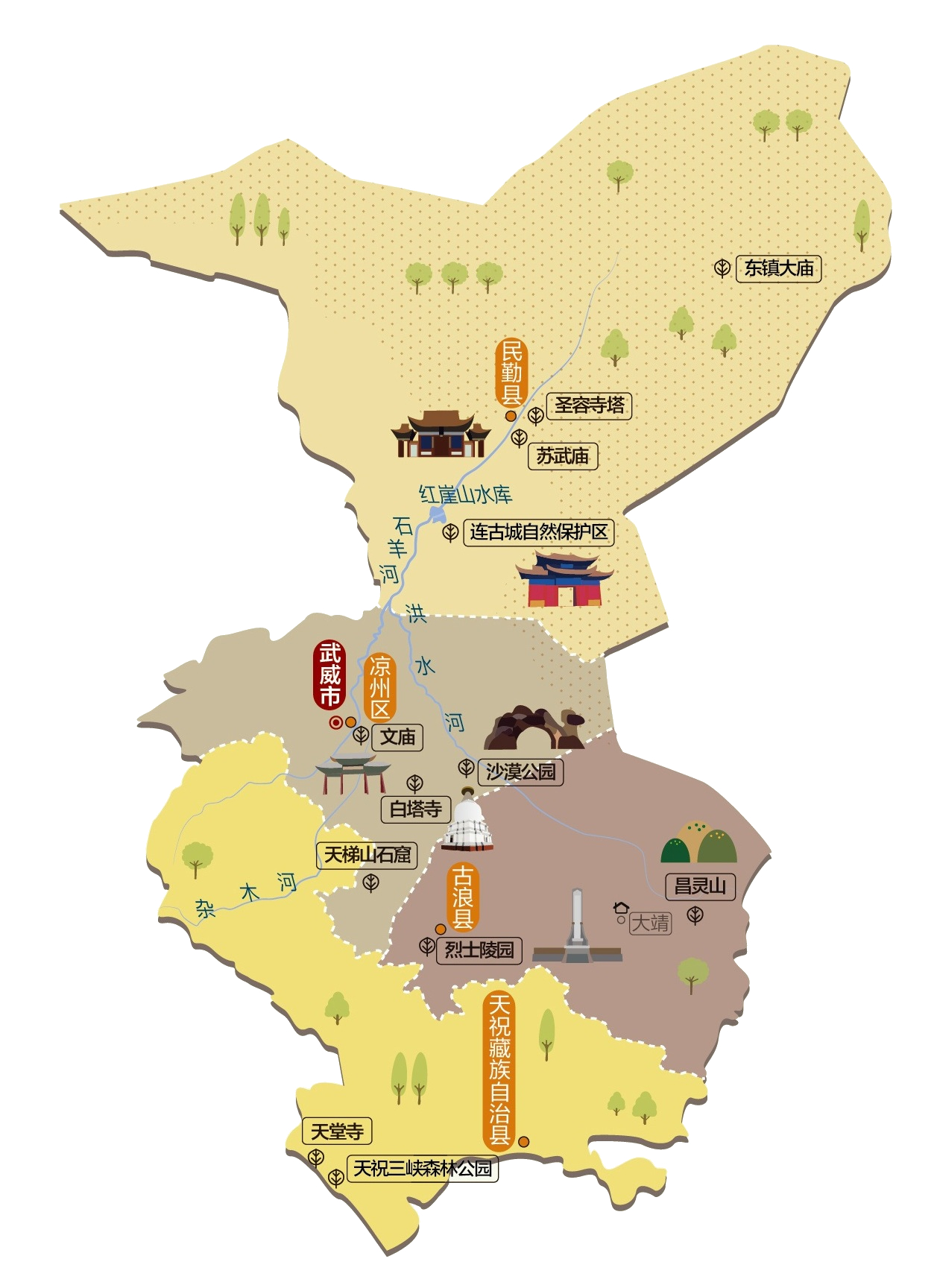 武威市,中华人民共和国甘肃省下属的地级市,市政府驻凉州区,位于西北地区中部,河西走廊东端,有“天下要冲”,“国家蕃卫”之称。古称凉州、姑臧,是国家历史文化名城,河西四郡之一,前凉、后凉、南凉、北凉、大凉和西夏(夏神宗)均曾建都于此,故称“西北首府”,“六朝古都”。 武威市境东南邻白银市,南界兰州市与青海省海东市,西临金昌市、张掖市与青海省海北州,北、东两面接内蒙古自治区阿拉善盟。地处祁连山与腾格里沙漠之间,南部有冷龙岭、乌鞘岭、毛毛山等高山,并有冰川分布;中部为河西走廊,绿洲与戈壁荒漠相间;北部为戈壁、沙漠和剥蚀低山,植被稀疏。河流多发源于祁连山,属石羊河水系。全市总面积32,347平方公里,2023年年末常住人口为142.73万。武威市现辖1个市辖区、2个县、1个自治县。 市辖区:凉州区 县:民勤县、古浪县 自治县:天祝藏族自治县