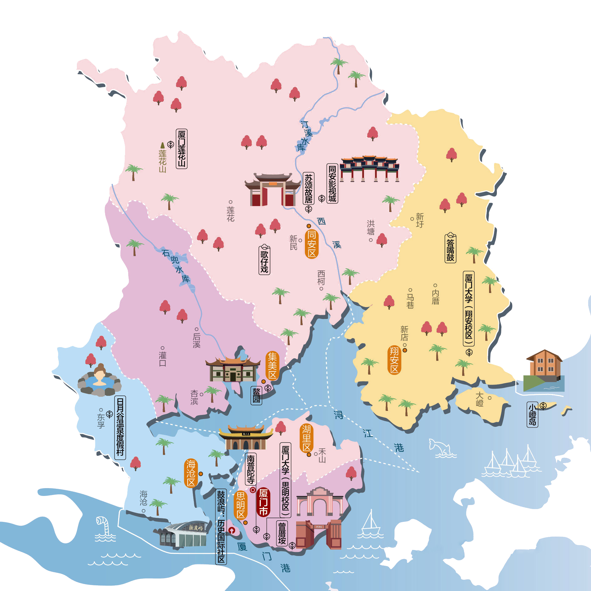 厦门市,别称鹭岛,简称厦或鹭,地处福建省东南部。是中国东南沿海重要的中心城市、最早对外开放的四个经济特区之一,亦属计划单列市及副省级城市。厦门市和泉州市、漳州市接壤,与金门县隔海对望,是由厦门岛、鼓浪屿等岛与海沧、集美、同安、翔安等沿海地区组成的海湾型城市。 厦门市是中国著名的侨乡、亚洲重要的交通枢纽:厦门港为中国第7大、世界第13大集装箱港口,厦门高崎国际机场为中国第8大出入境空港,第4大国际及地区中转空港。此外,厦门是著名的风景旅游城市,有“城在海上,海在城中”的美誉,著名景点有鼓浪屿(2017年被列为世界文化遗产)、万石山、集美学村、南普陀寺、厦门大学等。厦门市下辖6个市辖区:同安区、翔安区、集美区、湖里区、思明区、海沧区。