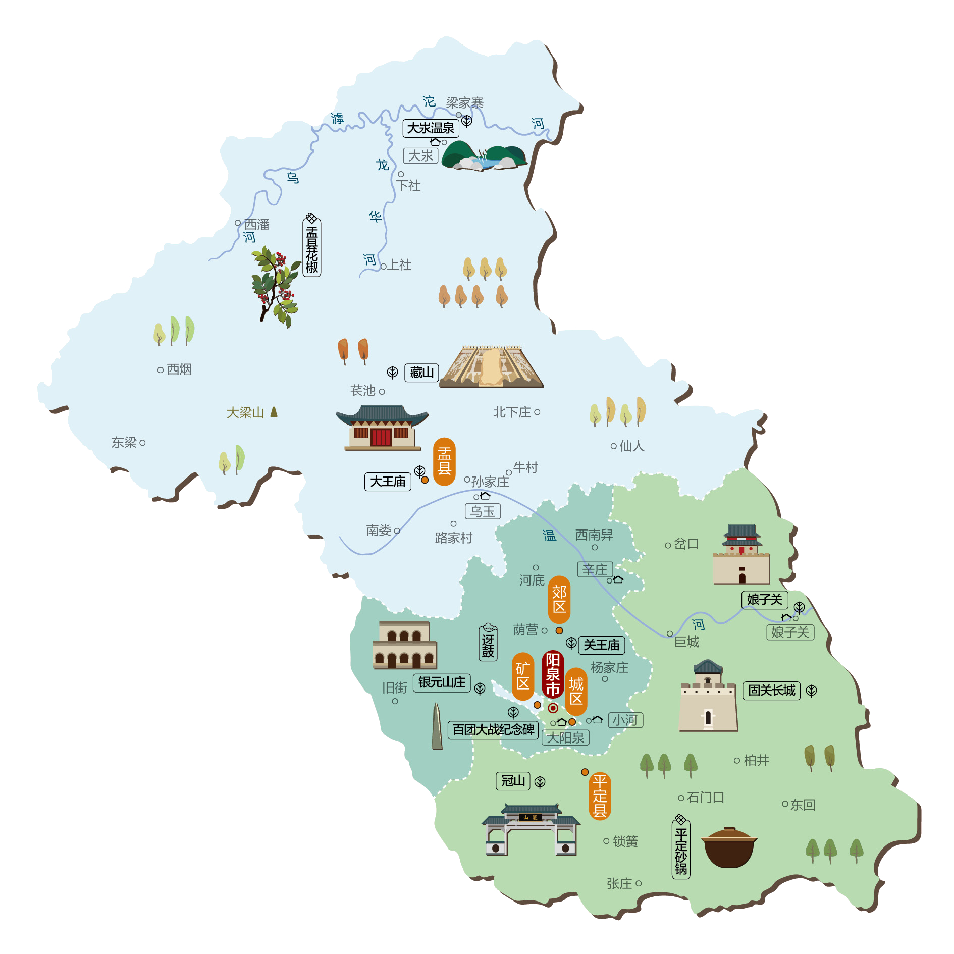 阳泉市,中国山西省下辖地级市,古称“漾泉”,别称山城、中共创建第一城,位于山西省中东部,北与忻州市毗邻,东隔太行山与河北省相望,西接太原市,南邻晋中市,地处黄土高原东缘,属于山西东部山地,境内地貌以山地为主,其余为丘陵和平原;属暖温带半湿润大陆性季风气候区 。阳泉市是一座新兴工业城市,是三晋门户,晋冀要衡,又处于东部发达地区与中西部的结合地带,还位于环渤海与长江三角洲的两大经济区的合理运输扇区内,经天津、青岛、黄骅港可东出渤海。20世纪80年代开始,阳泉利用煤炭资源优势,经济得到迅速发展,一路领跑山西各市。阳泉市现辖3个市辖区、2个县。 市辖区:城区、矿区、郊区 县:平定县、盂县