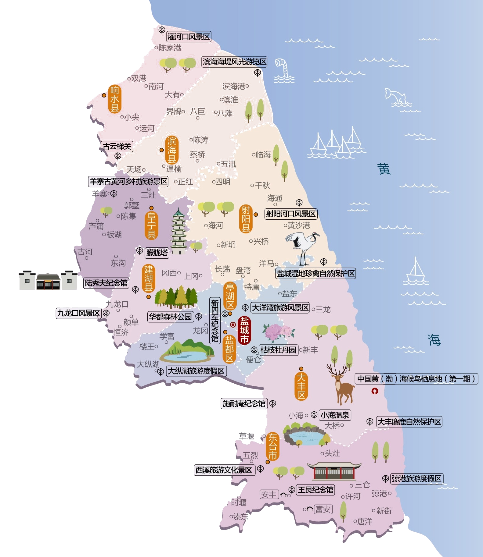 盐城市,简称盐,又称盐阜,古称盐渎,是中华人民共和国江苏省下辖的地级市,位于江苏省中东部沿海。海岸线长582公里,占全省海岸线总长度的61%。市境南邻南通市、泰州市,西界扬州市、淮安市,西北接连云港市,东濒黄海。地处长江三角洲北部,苏北灌溉总渠以北属黄淮平原,以南分为两部分——串场河以西属里下河平原,以东属滨海平原,境内地势平坦,河渠纵横。灌河、废黄河、苏北灌溉总渠、射阳河、新洋港、通榆运河、串场河等河网贯通市境。全市总面积16,931平方公里,是江苏省面积最大的地级市,市人民政府驻盐都区世纪大道21号。盐城市现辖3个市辖区、5个县,代管1个县级市。 市辖区:亭湖区、盐都区、大丰区 县级市:东台市 县:响水县、滨海县、阜宁县、射阳县、建湖县