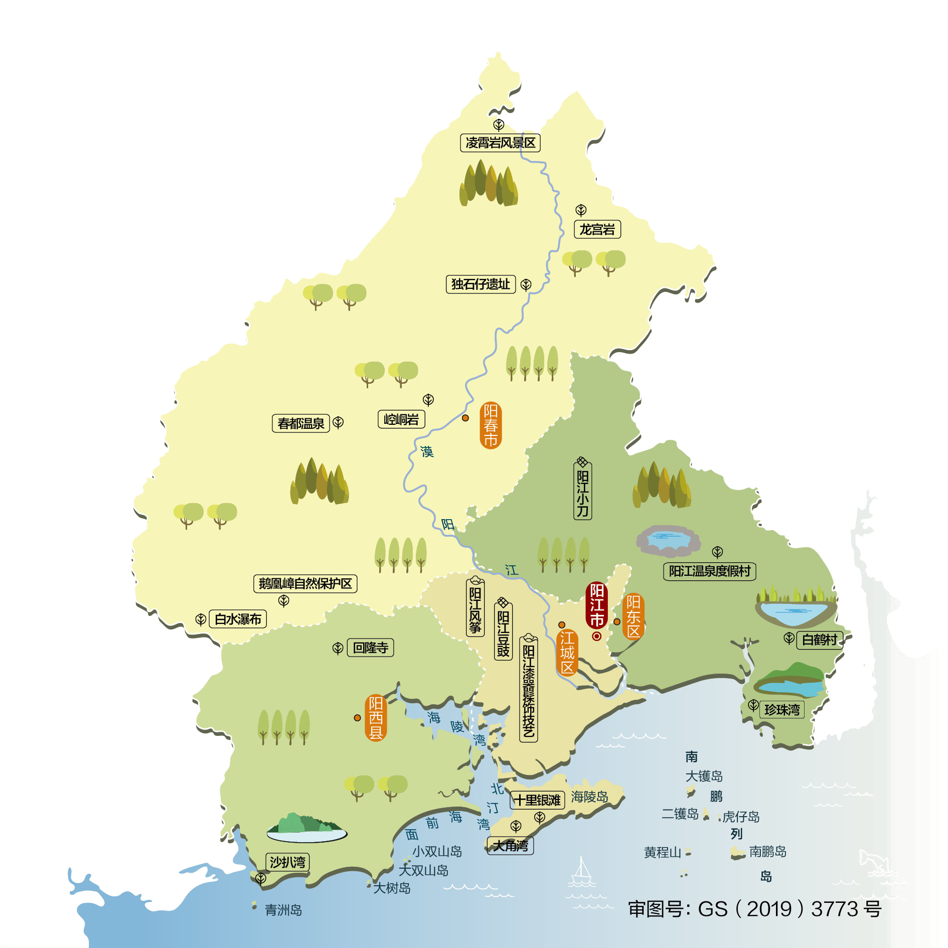 阳江市(Yangjiang City) ,别称鼍城、阳江城。 广东省辖地级市, 珠江口西岸都市圈城市之一 、北部湾城市群城市之一 ,粤港澳大湾区与北部湾城市群之间的沿海经济带重要战略支点城市、著名滨海旅游城市;广东省海洋大市;地处广东西南沿海,扼粤西要冲,东部、西部和北部为群山所环抱,南面濒临南海,属亚热带季风气候。全市陆地面积7966.8平方公里。境内文化底蕴深厚,是岭南文化的一部分,“高凉文化”“海丝文化”“漠阳文化”等多种文化交相辉映,同时也受“广府文化”影响,拥有古村落、物质文化遗产、古港口、“南海一号”博物馆等文化资源。阳江市下辖2个市辖区、1个县,代管1个县级市。 市辖区:江城区、阳东区 县级市:阳春市 县:阳西县 另外,阳江市还设立以下经济管理区:阳江高新技术产业开发区、海陵岛经济开发试验区、岗侨管理区。