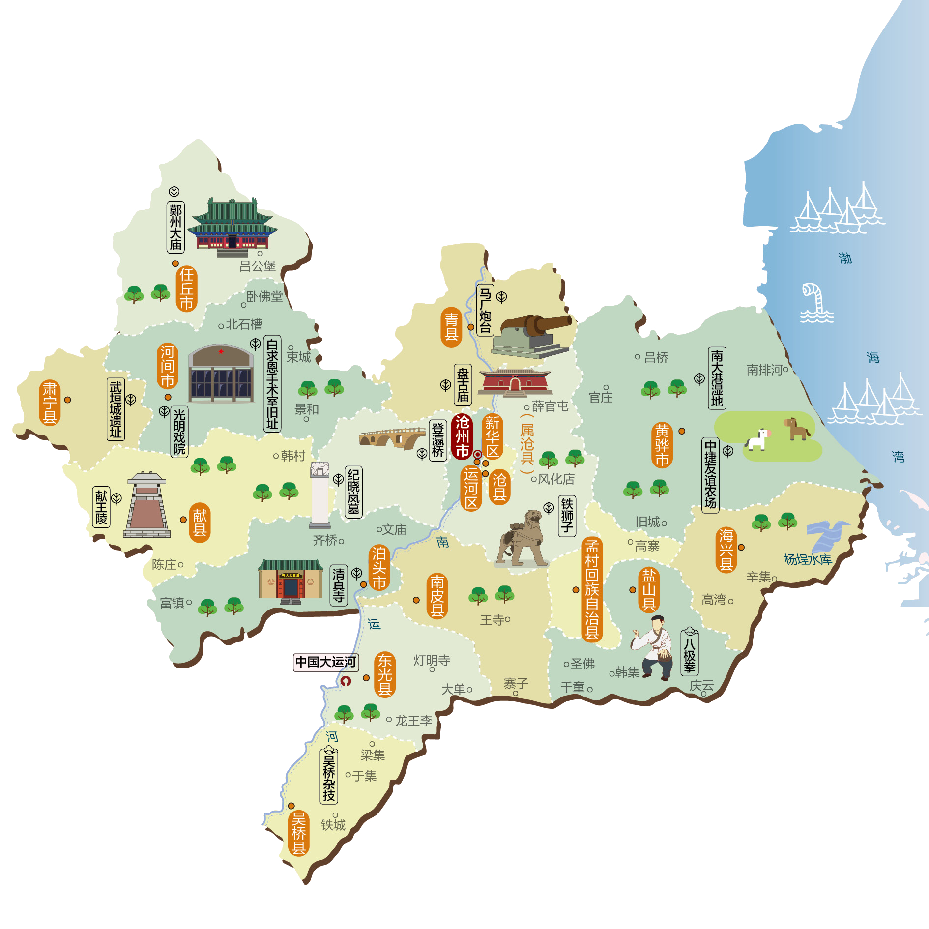 沧州市,简称沧,别称狮城,是中华人民共和国河北省下辖的地级市,位于河北省东部偏南。北界天津市、廊坊市,西北接保定市,西南连衡水市,东南邻山东省德州市、滨州市,东临渤海。地处华北平原东部,地势平坦。南运河、子牙新河流经境内,市人民政府驻运河区解放西路39号。沧州盛产海盐,并拥有丰富石油资源,亦是环渤海经济圈和京津冀城市群的重要的区域中心城市。沧州市现辖2个市辖区、9个县、1个自治县,代管4个县级市。 市辖区:运河区、新华区 县级市:泊头市、任丘市、黄骅市、河间市 县:沧县、青县、东光县、海兴县、盐山县、肃宁县、南皮县、吴桥县、献县 自治县:孟村回族自治县 此外,沧州市设立以下行政管理区: 渤海新区(包括原中捷农场、南大港农场) 国家级沧州临港经济技术开发区 沧州经济开发区