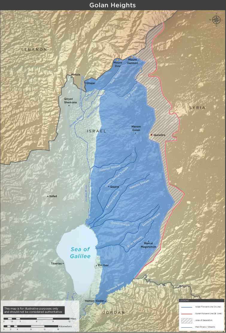 戈兰高地(阿拉伯语:هضبة الجولان,罗马化:Hadhbat al-Jaulan,希伯来语:רמת הגולן,罗马化:Ramat HaGolan)南北长71公里,中部最宽处约43公里,面积1800平方公里(其中以色列控制1200平方公里)。位于叙利亚西南部,约旦河谷地东侧。东到鲁卡德河、南到雅莫科河、北到黑门山东坡,其西南临约旦河上游的加利利海,具有丰富的水资源。海拔最高处为黑门山(2814米)。