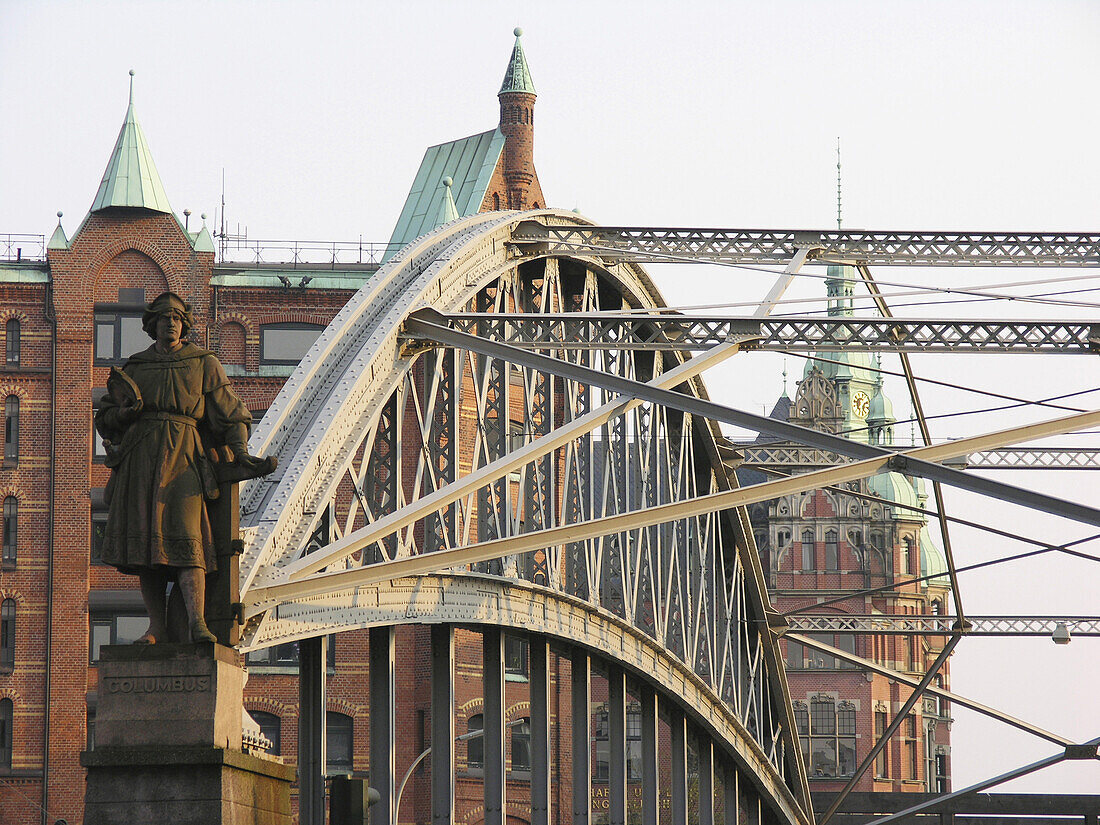 在通往历史悠久的仓库城的入口处——谷仓桥上,1903 年竖立了四座国际航海家和探险家的雕像,以彰显该城市的海外贸易:克里斯托弗·哥伦布、瓦斯科·达·伽马、詹姆斯·库克和费尔南多·麦哲伦。后两者在第二次世界大战期间被摧毁,前两者至今仍矗立在桥北侧的两侧。意大利航海家克里斯托弗·哥伦布(约 1451 年生,1506 年卒)的雕像是由卡尔·博尔纳创作的。为了寻找通往亚洲的短途海路,哥伦布向西航行。1492 年,他遇到了一个未知的土地,后来发现这是一个巨大的大陆:美洲。在 1504 年之前,他总共进行了四次向西的航海之旅,然后于 1506 年在西班牙去世。
