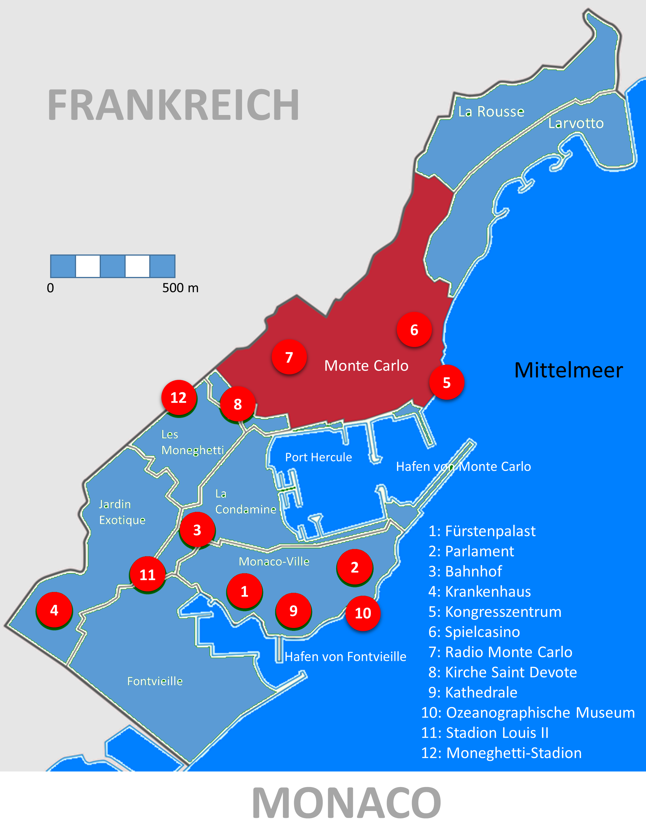 La Condamine MC-CO Fontvieille MC-FO Jardin Exotique MC-JE La Colle MC-CL La Gare MC-GA La Source MC-SO Larvotto MC-LA Malbousquet MC-MA Monaco-Ville MC-MO Moneghetti MC-MG Monte Carlo MC-MC Moulins MC-MU Port-Hercule MC-PH Saint-Roman MC-SR Sainte-Dévote MC-SD Spélugues MC-SP Vallon de la Rousse MC-VR