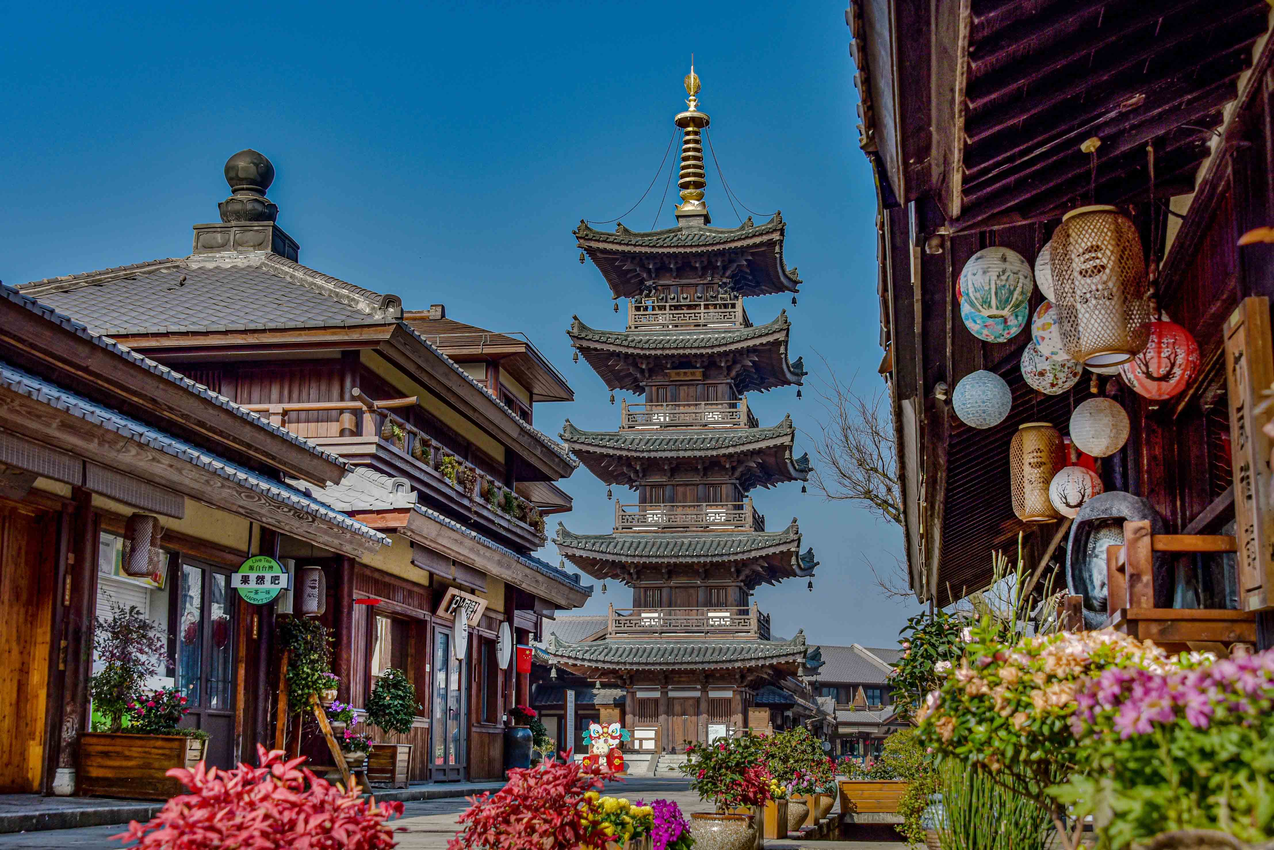 拈花塔是古典木结构楼阁式塔,四方五层,由须弥座台基、塔身、塔刹组成,是无锡拈花湾小镇主街区香月花街的最高点。