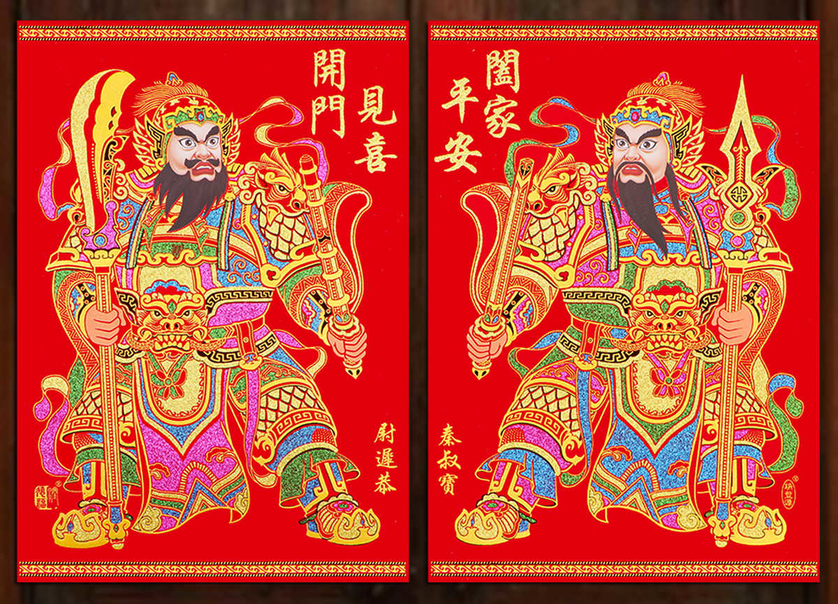 门神,即司门守卫之神,是农历新年贴于门上的一种画类。 作为民间信仰的守卫门户的神灵,人们将其神像贴于门上,用以驱邪避鬼、卫家宅、保平安、助功利、降吉祥等,是中国民间深受人们欢迎的守护神。 按照传统习俗,每到春节前夕,家家户户便忙碌起来写挥春贴对联和门神,祈福来年。