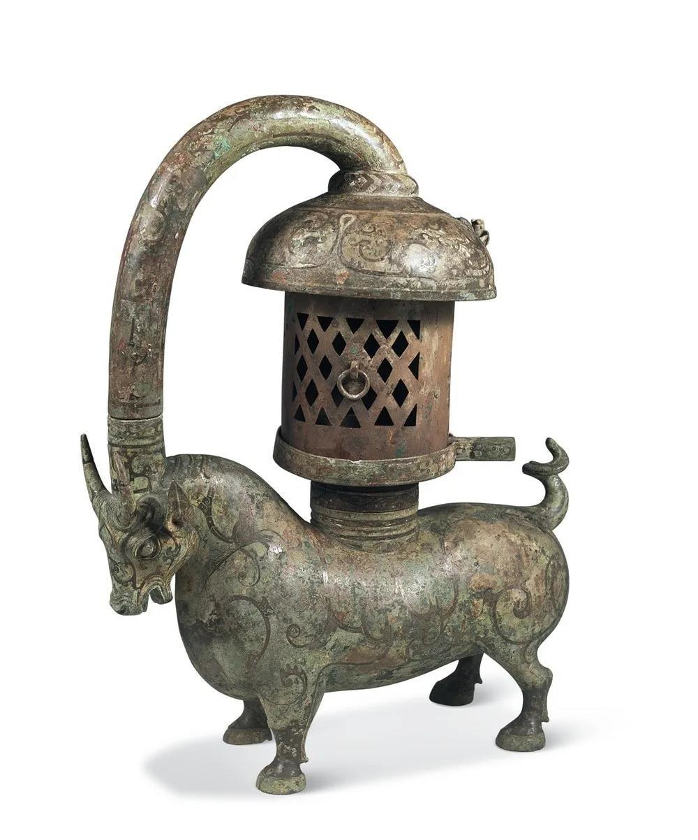 该铜牛灯不但设计精美,而且在制作时巧用铜银二种不同材质的色泽,形成颜色的完美搭配。铜牛灯通体光滑,工艺精湛,整体纹饰运用流云纹、三角纹、螺旋纹图案为地,饰以龙、凤、虎、鹿以及各种神禽异兽等图案,线条流畅,飘逸潇洒,是汉代众多青铜灯具中实用与艺术完美结合的上乘之作。 错银铜牛灯由灯座、灯盏、烟管三部分组装而成。它的三部分均可拆卸,使用和擦洗相当方便。灯座是一俯首站立、双角上耸、四足矮而敦实、尾卷曲向上、雄浑壮硕的黄牛。牛腹中空,背负圆形灯盘,灯盘一侧设置扁平把手,便于转动灯盘,盘上饰两片可以灵活转动的灯罩,其中的一片刻镂空菱形斜方格形纹,起到散热、挡风和调光的作用。灯罩上紧扣穹顶形罩盖,盖顶之上均匀弯曲的烟管与牛头顶上方凸出的短管紧密套接。当灯火点燃时,所产生的烟尘通过烟管导入灯座腹腔中的清水被溶解,从而确保室内空气的清新。