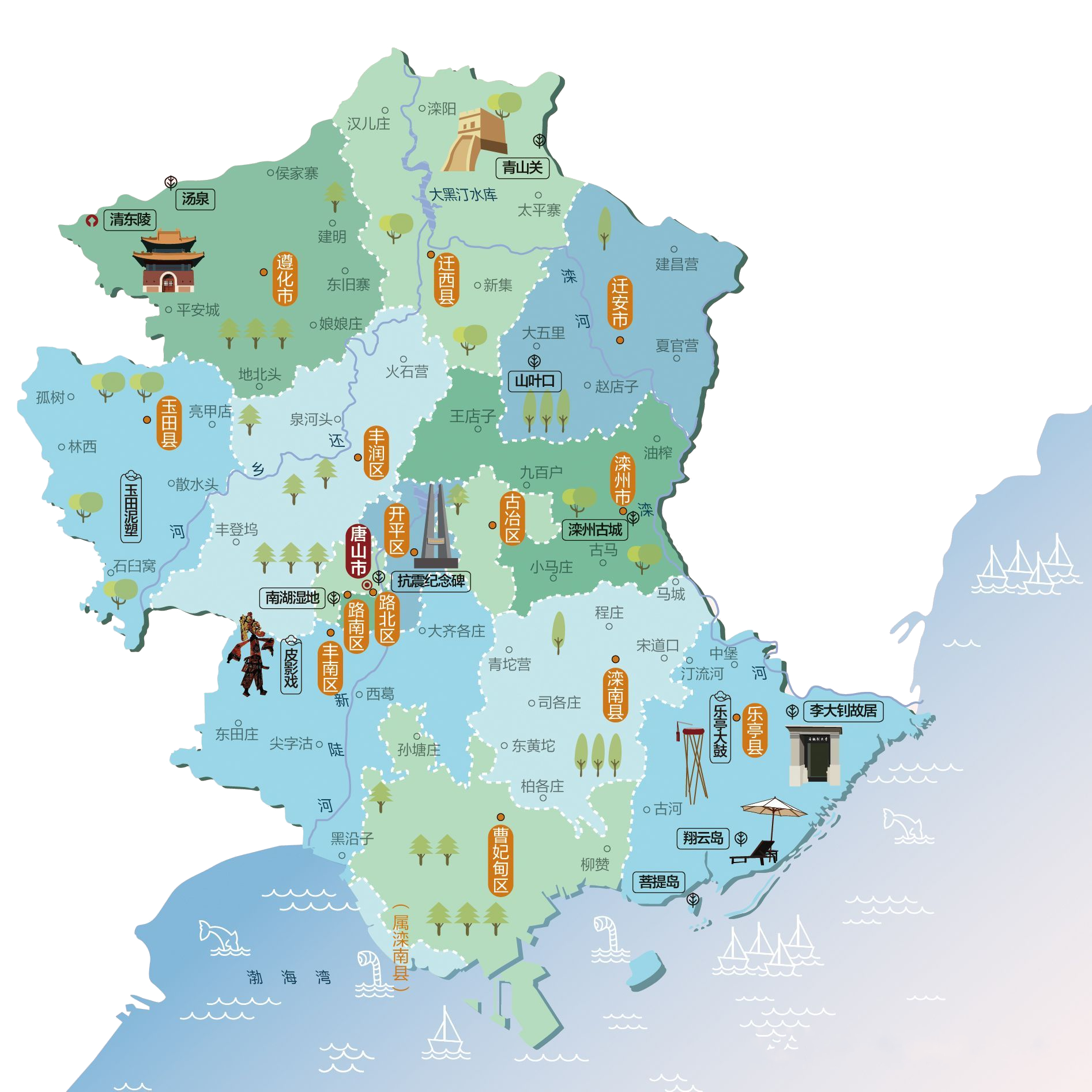 唐山市是中华人民共和国河北省所辖地级市、省域中心城市,京津冀城市群东北部中心城市,国务院1982年批准的较大的市。位于河北省东部,华北平原东北部,地处环渤海中心地带和通往东北地区的交通要道,南临渤海,北依燕山,与承德市毗邻,东隔滦河与秦皇岛市相望,西与天津市毗邻,市人民政府驻路北区西山道3号。唐山现为全国重要的能源原材料基地和重工业城市,工业基础雄厚,工业体系完备,钢铁、装备制造、能源(电力、煤炭、原油)、化工、建材、陶瓷等工业发达,有“钢城”“煤都”“北方瓷都”之称;同时也是京津冀城市群中重要的沿海开放城市和全国性综合交通枢纽之一,境内铁路、高速公路交织成网,唐山港货物吞吐量位居国内港口前列。唐山市现辖7个市辖区、4个县,代管3个县级市,共14个县级行政区划单位。 市辖区:路南区、路北区、古冶区、开平区、丰南区、丰润区、曹妃甸区 县:滦南县、乐亭县、迁西县、玉田县 县级市:遵化市、迁安市、滦州市