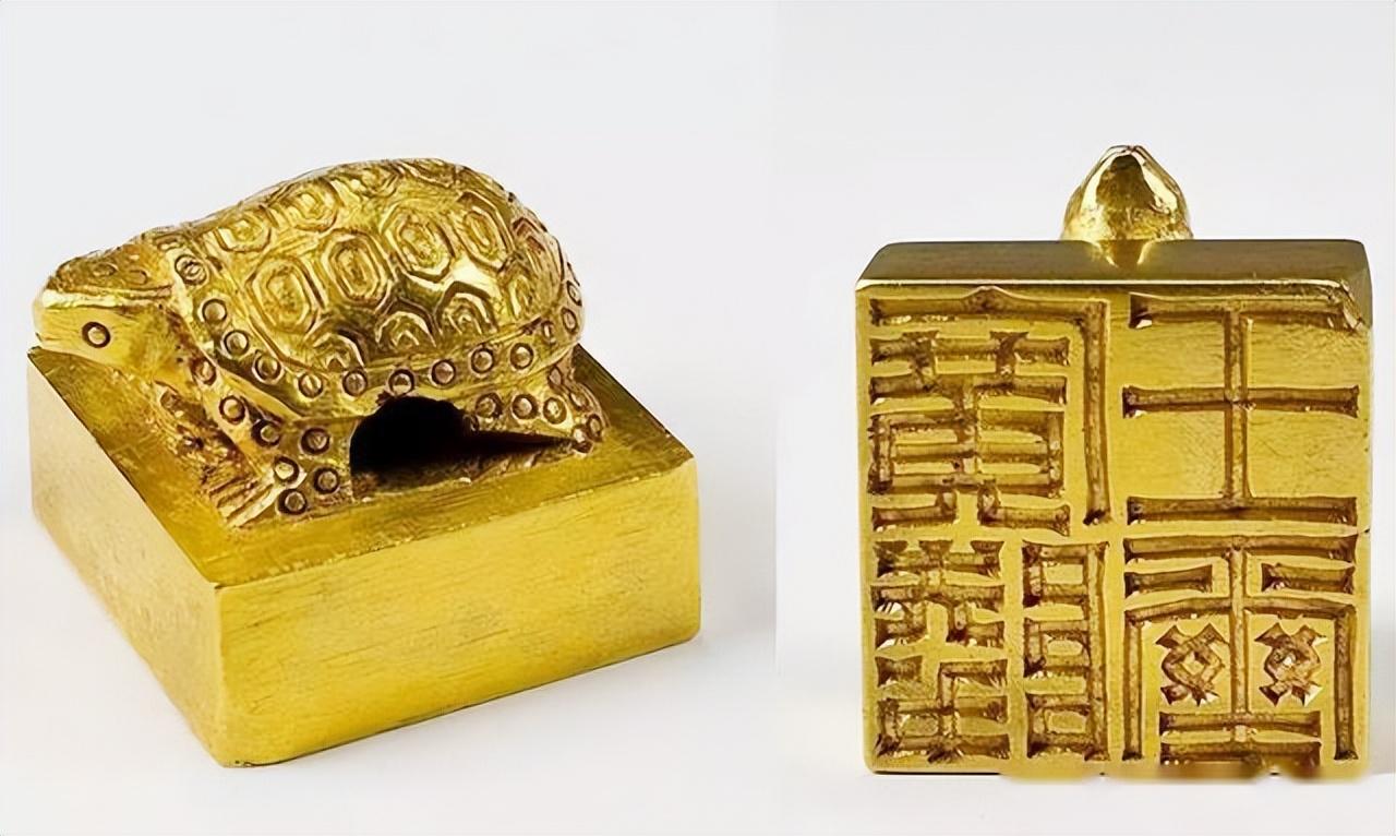 东汉“广陵王玺”金印是东汉光武帝刘秀第九子刘荆所用之印,1981年2月24日出土于江苏省邗江县甘泉山2号墓,现藏于南京博物院。东汉“广陵王玺”金印为纯金铸成。印面呈方形,上立龟钮,印面阴刻篆文“广陵王玺”四字,在龟背上铸有六角形图案的龟背纹。具体尺寸为边长2.372厘米、高3.066厘米、宽2.375厘米,重量为122.87克。是迄今发现的唯一一枚汉代诸侯王金印,与《后汉书·舆服志》中太子与诸王用龟钮金印的记载相符。 金印也证实了中国古代诸侯佩印文献的真实可靠性。