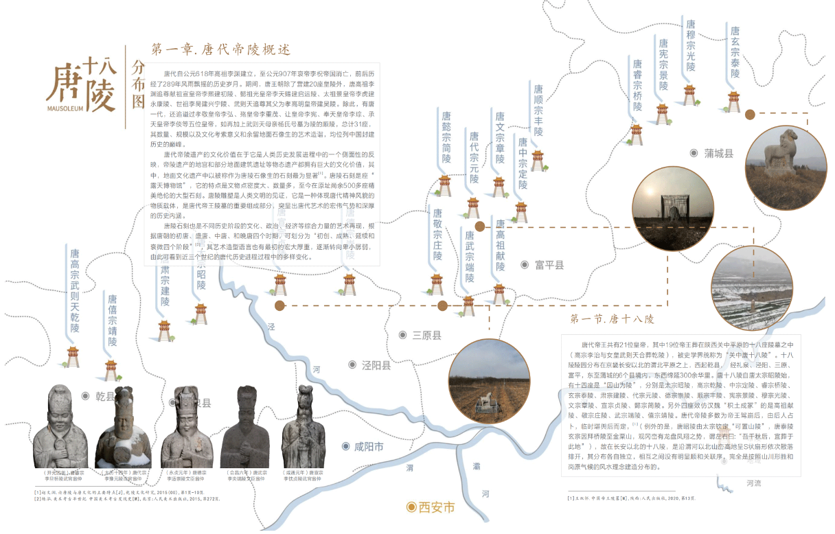 唐代帝陵,位于陕西省渭南市、咸阳市境内,是唐王朝修建的帝王陵墓,共有十八座帝陵。 唐代帝陵始建于唐贞观十年(636年),历时二百九十年,先后修建了十八座规模庞大,气势宏伟的帝陵。以年代为序分别为唐高祖献陵、唐太宗昭陵、唐高宗和武周女皇合葬的乾陵、唐中宗定陵、唐睿宗桥陵、唐玄宗泰陵、唐肃宗建陵、唐代宗元陵、唐德宗崇陵、唐顺宗丰陵、唐宪宗景陵、唐穆宗光陵、唐敬宗庄陵、唐文宗章陵、唐武宗端陵、唐宣宗贞陵、唐懿宗简陵、唐僖宗靖陵。这些唐陵分布在关中平原渭河以北北山山脉各山峰的南麓,东西向绵延150余公里,号称“关中十八唐帝陵”。