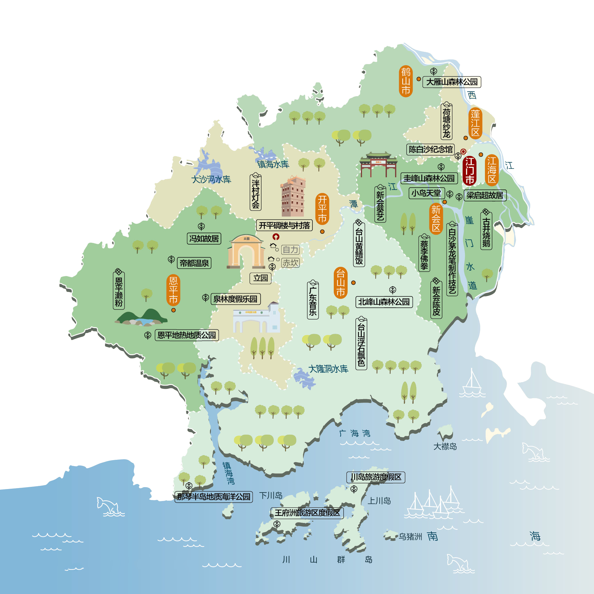 江门市,别称五邑、四邑,广东省辖地级市,粤港澳大湾区重要节点城市,在粤港澳大湾区中处于“承东启西”的位置,是大湾区通向粤西和大西南的枢纽门户、“珠江西岸新增长极和沿海经济带上的江海门户” ,江门市位于珠江三角洲西岸城市中心。元至正后期至明洪武初年(约1360-1370年),在肄水(西江)出口江门海西岸地域形成商贸墟集,称江门墟。民国十四年(1925年)11月26日,为省辖市。江门历史悠久,文化底蕴深厚,五邑文化和侨乡文化独具魅力;530多万海内外华侨华人和港澳台侨胞分布在145个国家和地区,素有“中国侨都”美誉。江门是重要的广府人聚集地之一, 亦是广府文化的代表城市之一。江门市现辖3个市辖区,代管4个县级市。 市辖区:蓬江区、江海区、新会区 县级市:台山市、开平市、鹤山市、恩平市