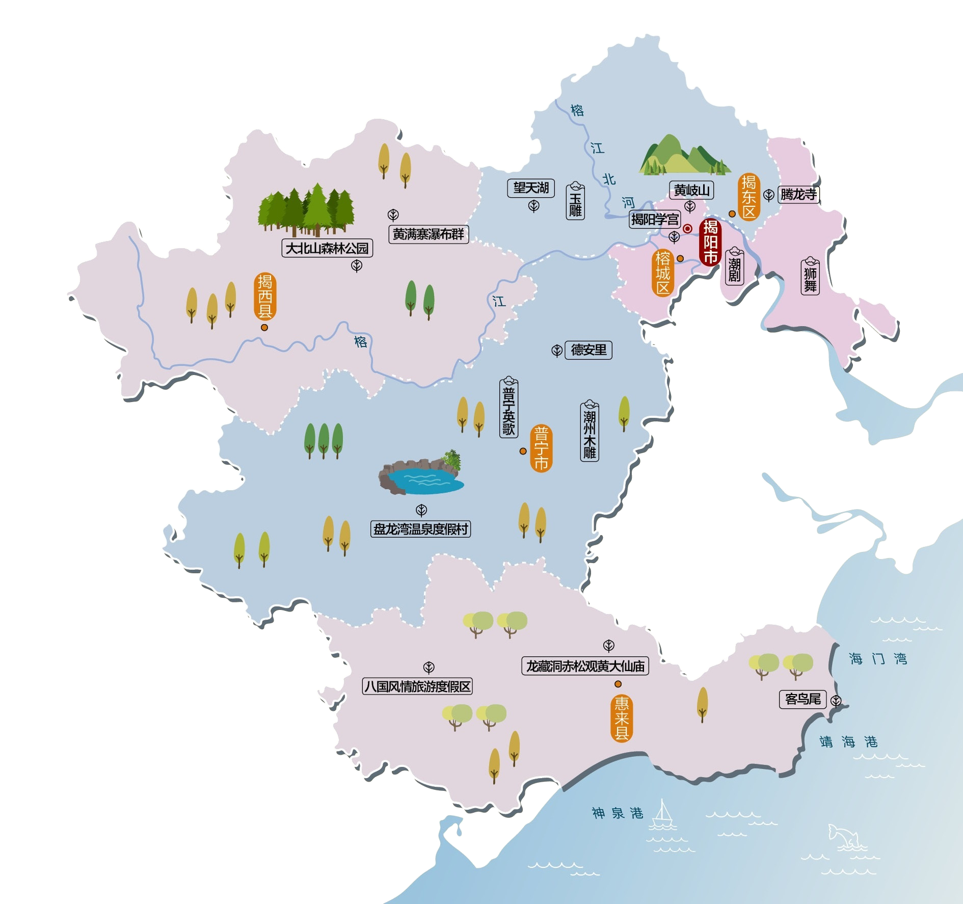 揭阳市(Jieyang city), 广东省地级市,是潮汕四市之一, 著名的华侨之乡, [位于广东省东南部,粤港澳大湾区与海西经济区的地理轴线中心。 陆地面积5240平方公里,揭阳籍海外侨胞、港澳台同胞近700万人。揭阳是广东沿海经济带东翼主战场,揭阳滨海新区是广东省政府专门规划、专项政策打造的广东沿海经济带重点平台。揭阳是具有光荣革命传统的红色沃土,是岭南水城,翡翠玉都,美食胜地,潮汕文化发祥地之一 ,以猪脚饭、潮汕菜、工夫茶、英歌舞、三山国王等名闻遐迩。秦汉时期的揭阳县是潮汕和粤东地区在最早期的行政区。揭阳市下辖2个市辖区、2个县,代管1个县级市。 市辖区:榕城区、揭东区 县级市:普宁市 县:惠来县、揭西县