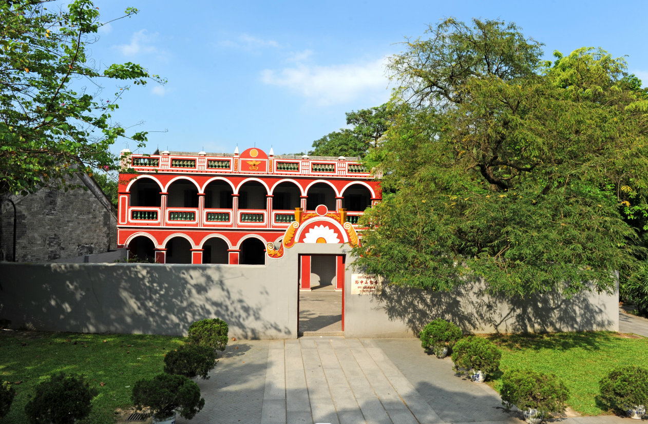 孙中山故居,位于广东省中山市翠亨村,坐东向西,占地500平方米,建筑面积340平方米。 清光绪十八年(1892年),孙中山兄长孙眉从檀香山汇款回来,由孙中山主持修建而成的。孙中山故居是一幢砖木结构、中西结合、独具特色的两层楼房。一道围墙环绕庭院;楼房外立面仿西方建筑,红墙、白线、绿釉瓶式栏杆,上下层前廊施7个连续券拱。屋顶女儿墙正中饰有光环,下塑一只口衔钱环的蝙蝠。楼房内部设计则用中国传统的建筑形式。
