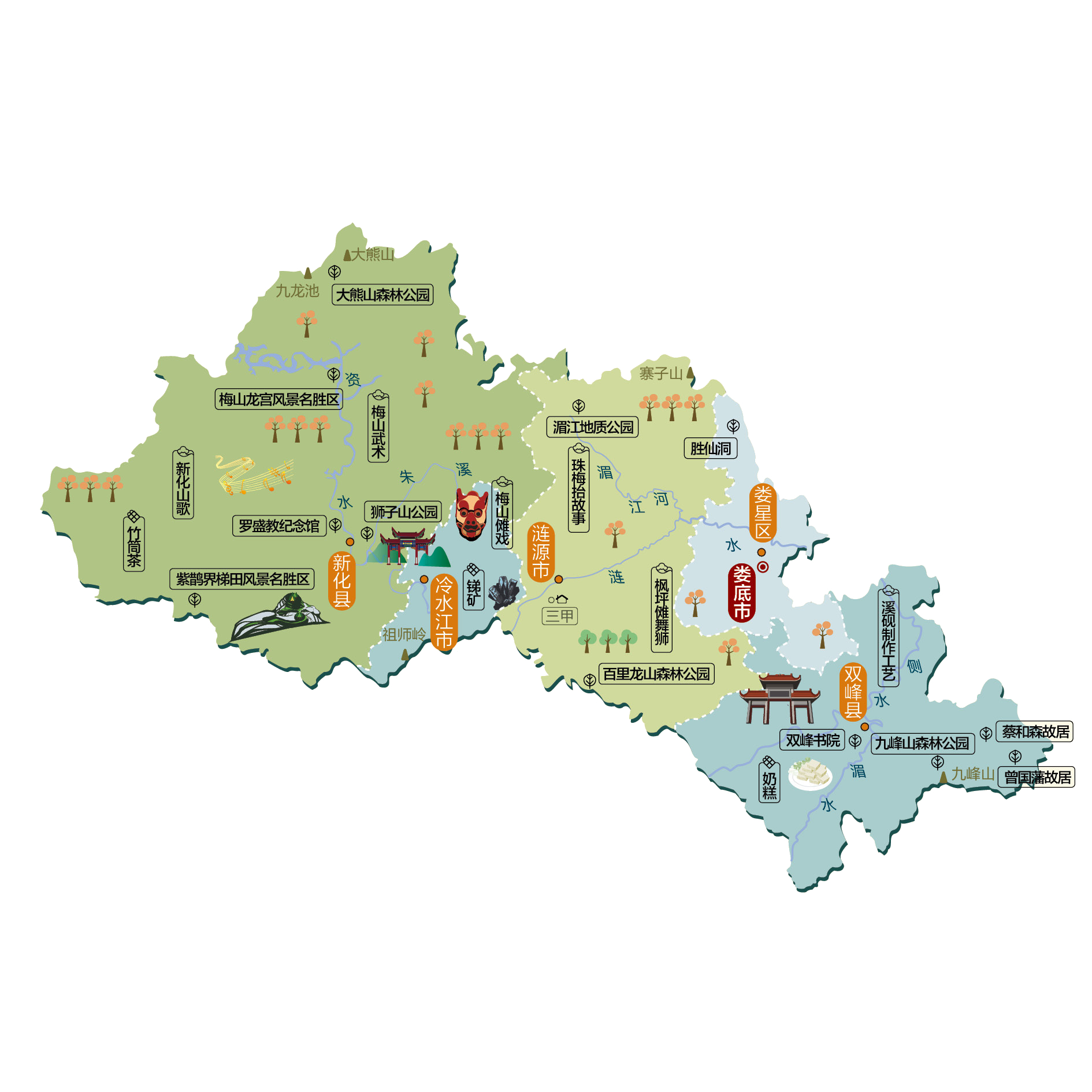 娄底市,湖南省辖地级市,别称星城,境内地势西高东低,呈阶梯状倾斜;西部山峰雄伟,地势险峻,海拔较高;东部地势逐步降低,地形起伏平缓,海拔较低。娄底市据传天上二十八星宿中的“娄星”和“氐星”在这里交相辉映,故而得名,是被后世尊为“战神”的中华民族三大始祖之一蚩尤的故里,是湖湘文化的主要发源地之一。区位优越,交通便捷,地处湖南几何中心,湘黔铁路和沪昆高铁横穿东西 ,洛湛铁路纵贯南北,40条铁路专用线沟通全市主要厂矿,形成了“米字型”铁路网。娄新高速全面贯通,新溆、安邵、娄益、娄衡、娄长高速同时规划建设,国省干道改造完成。娄底市下辖1个市辖区、2个县,代管2个县级市。 市辖区:娄星区 县级市:冷水江市、涟源市 县:双峰县、新化县