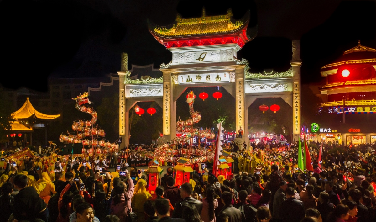 南岳庙会是传统的大型民间活动,从武宗二年起,已延续了千年。南岳庙会规模盛大,内容丰富,参加者众多,在江南一带影响很大。传说天符大帝每年农历五月十七日下凡,到衡山一带为百姓收瘟治病。南岳在这前后半个月内举行各种各样的宗教、民俗活动,以示庆贺。整个庙会以“三星点吉祥”活动拉开序幕,在农历五月十七前半个月,有人化装打扮成福星、禄星、寿星,在大庙正殿为四面八方来的少年儿童点红,就是点三点朱红在额头,据说这样可以消灾消难,易养成人。省内外的各路戏班子陆续开进南岳,在古镇四街和大庙内搭台唱戏,半个多月不间断。各路武林高手相聚南岳,或摆擂比武,或切磋武艺。 佛道两教借此机会要举行各种各样的大型法会,来自全国各地的僧道云集南岳,有的讲经说法,有的参学受戒。至于商贸交易市场,更是十分活跃,各地土特农副产品汇集南后,批发零售,各取所需,一派繁荣昌盛。到了现代,南岳庙会逐渐演变为宗教、民俗、文体、经贸于一体的大型节日,成为了南岳最具特色的旅游项目。