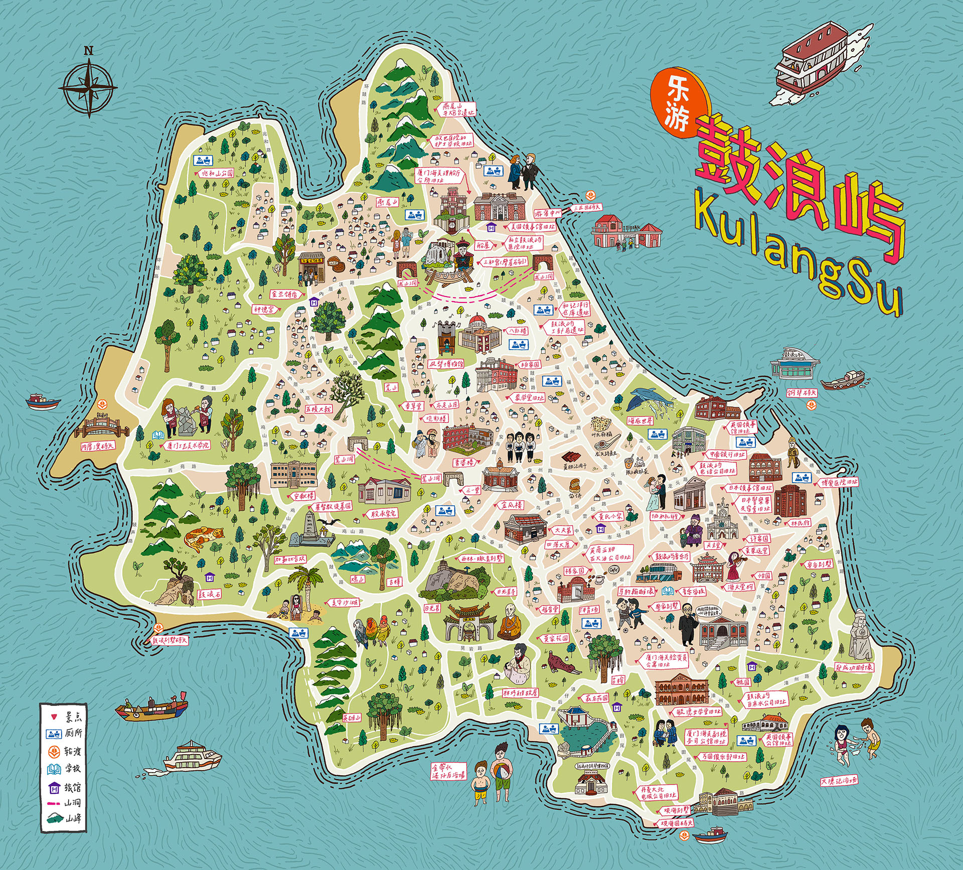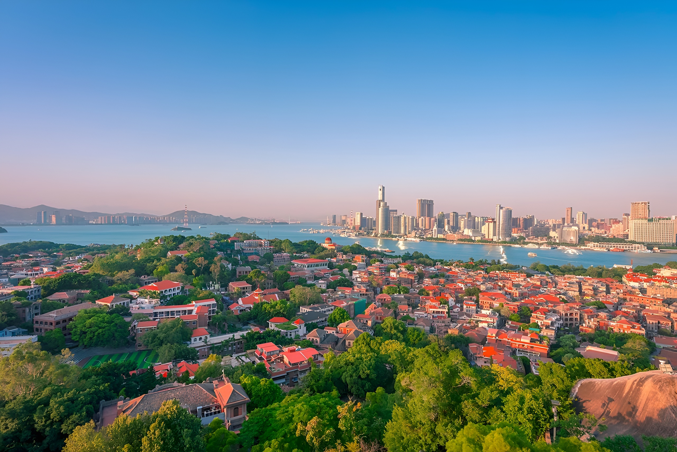 鼓浪屿地形西南高,东北低。 全岛多山,拥有海礁、山岩等自然景观。其海岸线蜿蜒曲折,四周环海。 属亚热带海洋性季风气候,全年温暖湿润,冬无严寒,夏无酷暑。 主要景点有日光岩、菽庄花园、皓月园等。 新石器时代,鼓浪屿就已出现。宋代开始有人定居。 ]明代得以开发,1573年,日光岩上出现了全岛最早的石刻“鼓浪洞天”。1650年,郑成功在日光岩操练水师,留下了“水操台”等遗址。 1842年英、美、西班牙三国相继在鼓浪屿设领事。 [20]1945年,日本无条件投降,被日本独占的鼓浪屿回到厦门人民手中。 国民党统治时期,在鼓浪屿设区。新中国成立后仍称鼓浪屿区。 2003年厦门市鼓浪屿区撤销行政区后,设立鼓浪屿街道办事处。 2014年实施“全岛博物馆”计划,将重点历史建筑等纳入公共开放的无围墙生态博物馆系统,开展文物修缮设计方案。