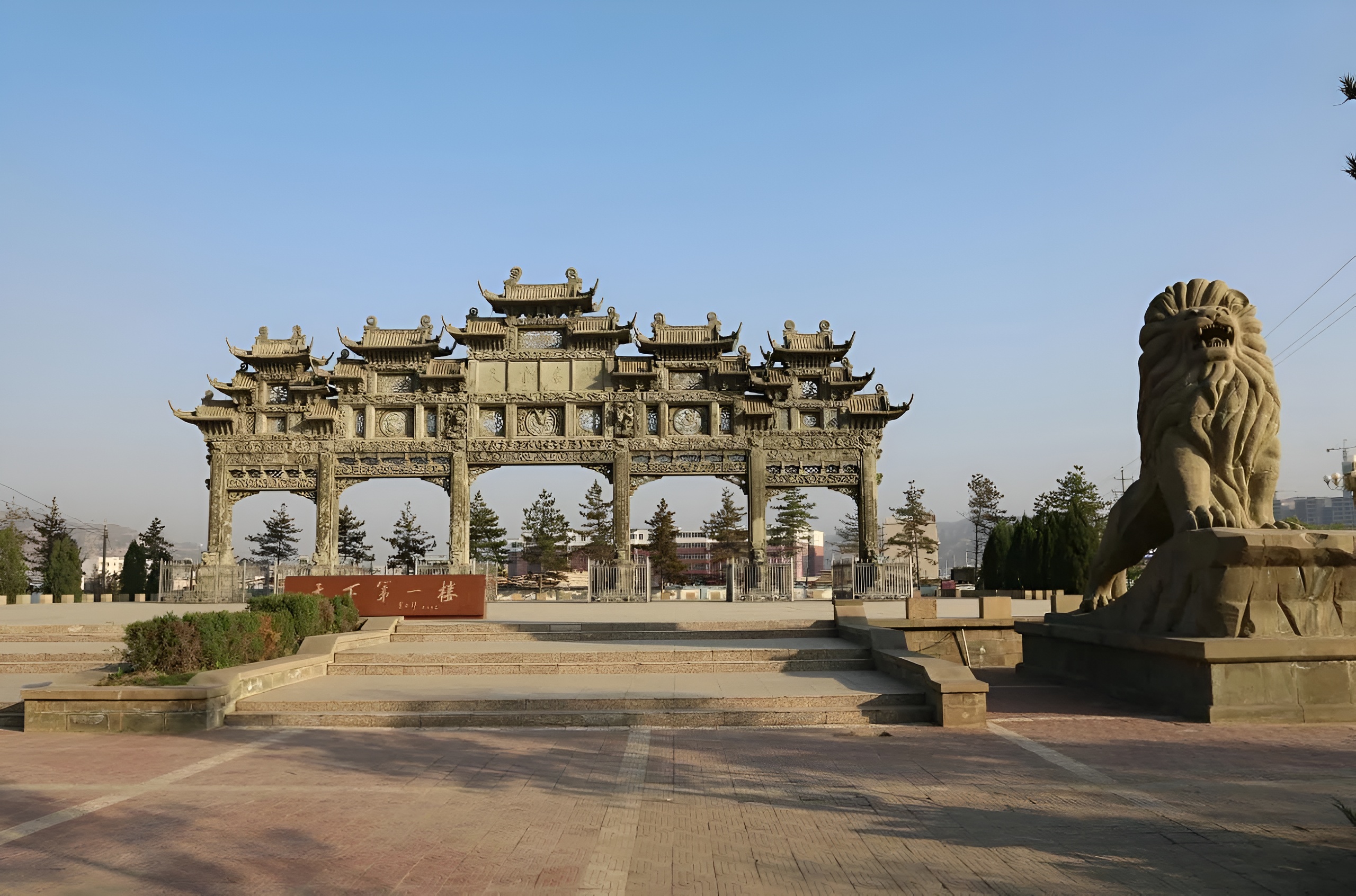 绥德天下第一石牌楼位于绥德县城东南,长36.9米,高16.9米,五门六柱十九楼双面单式结构,上有楹联66幅,由1118块石料组装而成,总重量400余吨,号称“天下第一楼”。 中国历代的石牌楼一般都是三门四柱,而绥德石牌楼为五门六柱,所以说这里是中国最大的石结构牌楼,石碑坊上铭刻了虞姑、扶苏、蒙恬、李广、昭君、文姬、韩世忠、马汝骥等历史故事,浮雕中刻有碧霄祥云、辉日明月,天女散,龙飞凤舞;三羊开泰,马到成功,鹤翔九霄,莺歌燕舞,莲花古松,牡丹寒梅,雕刻细腻生动,整体建筑雄伟壮观,气势磅礴。石牌楼的五门取意中兴之门,六柱蕴含大顺之意,十九楼中,十为是一,一元复始,气象万新,独开锦绣前程,九为多多益善,欣欣向荣。石牌楼大楼小楼互帮互衬,左楼右楼比肩并列、前楼后楼有呼有应,上楼下楼,下者基础沉稳,上者先领风光,整座石牌楼庄严肃穆、和谐统一。