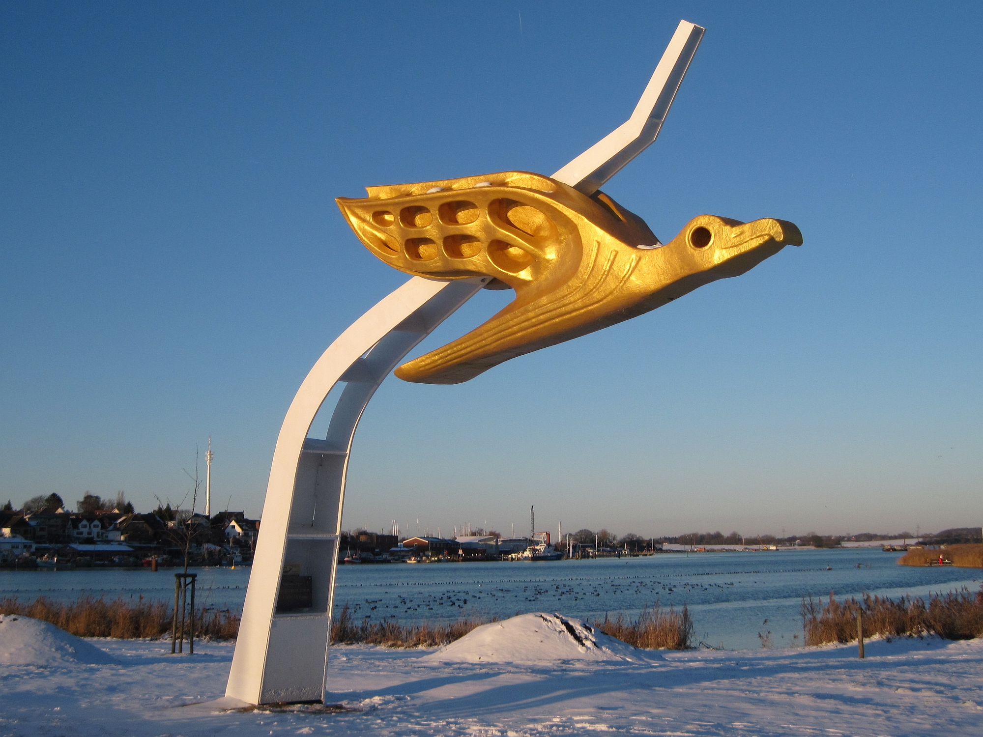 Original-Galionsfigur "Albatros" von 1958-1969 des SSS Gorch Fock. Die Galionsfigur wurde 29.11.2012 in Kappeln nahe dem südlichen Brückenkopf der Schlei-Brücke installiert.