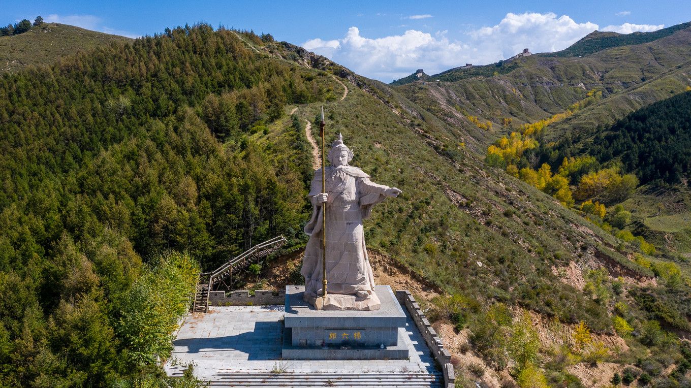 杨六郎石雕像,高19米,合57尺,寓意杨六郎57岁的人生历程。石雕像手持长矛,脚踏青山,身材魁梧,气宇轩昂,尽显杨家将的英雄风采,身后蜿蜒小路远观可通向雁门关长城。雁门关东临隆岭、雁门山,西靠隆山,两山对峙,形如闹门,每年大雁往飞其间,故称雁门。春秋战国时期,赵武灵王在此置有雁门郡,唐朝置关,名曰西烃关,也名雁门关。