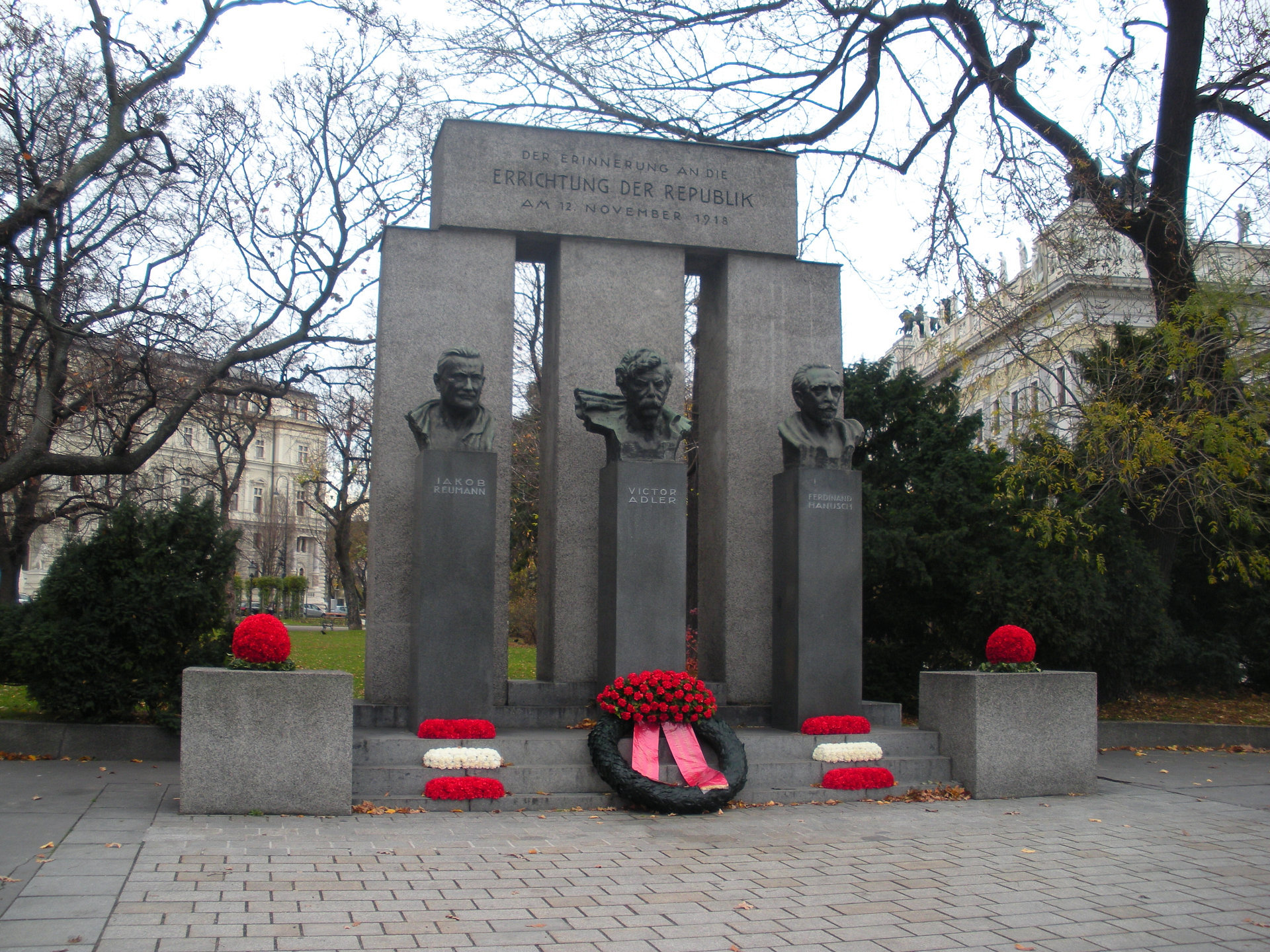 维也纳的共和国纪念碑(也称为共和国纪念碑)是为了纪念 1918 年 11 月 12 日德意志奥地利共和国的成立而建。它位于卡尔·伦纳环路,在议会大厦和埃普斯坦宫之间,格雷特·雷霍尔公园前面。
