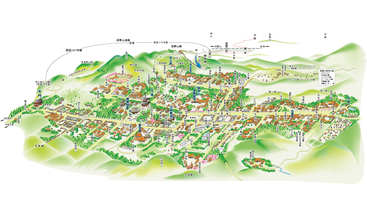 高野山(こうやさん)是位于日本和歌山县里标高约1,000米前后的山群中的一个地域,在行政划分上隶属于伊都郡高野町,也是该町的核心聚落和市中心所在。 在平安时代的弘仁7年(816年)弘法大师空海在此修行并建立了金刚峰寺,后来成为高野山真言宗总本山。整个山中的寺院总数约有117间,于平成16年(2004年)7月,被联合国教科文组织登记‘纪伊山地的圣地及朝圣路’列为世界遗产之一。高野山同时也是金刚峯寺的山号。