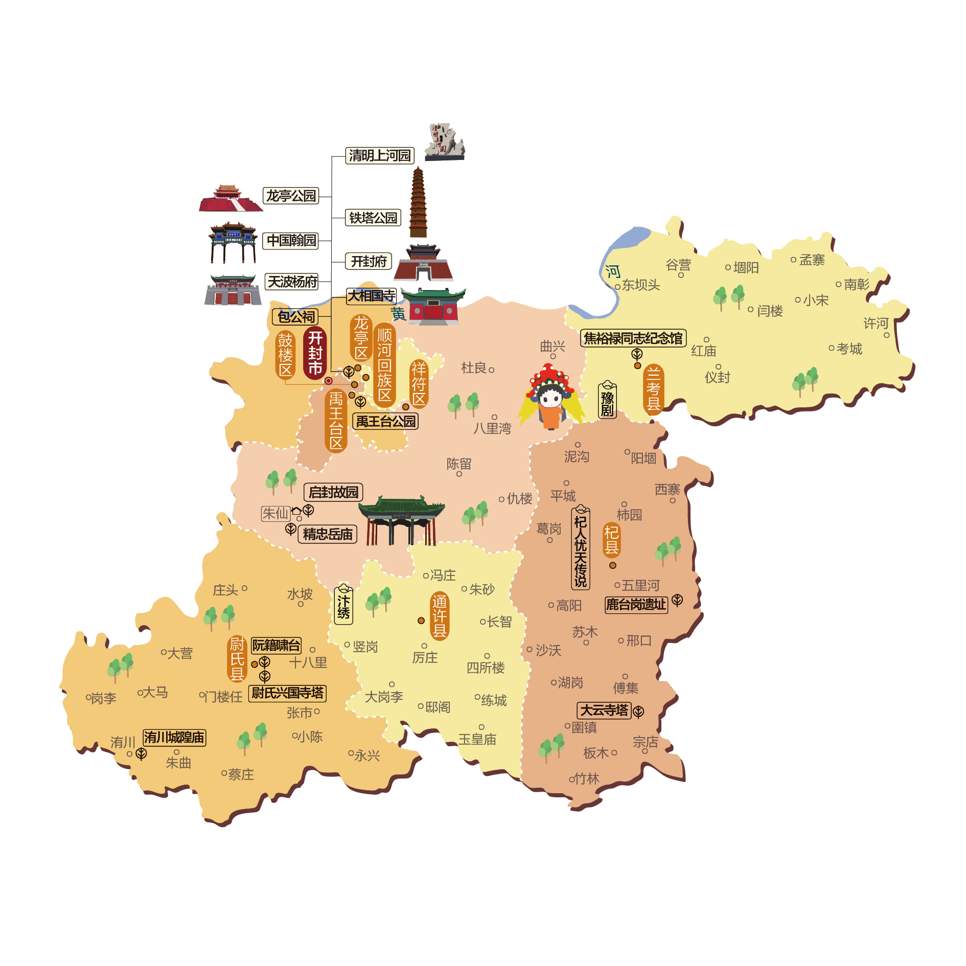 开封市,简称汴,古称老丘、启封、大梁、浚仪、汴京、汴梁、祥符等,是中华人民共和国河南省下辖的地级市,位于河南省中东部。市境东与商丘市相连,南与许昌市、周口市相接,西与郑州市毗邻,北隔黄河与新乡市相望,东北与山东省菏泽市接壤。地处华北平原腹地,黄河流经北部边缘,贾鲁河、惠济河从西北向东南流经境内,分别注入颍河、涡河。全市总面积6,240平方公里,总人口约469万人,市人民政府驻鼓楼区晋安路1号。开封迄今已有4100馀年的建城史和建都史,先后有夏朝,战国时的魏国,五代时期的后梁、后晋、后汉、后周及北宋相继在此定都,北宋称此为东京开封府。开封是世界上唯一一座城市中轴线从未变动的都城,城摞城遗址在世界考古史和都城史上少有。北宋首都东京开封府更是当时世界第一大城市。有著“琪树明霞五凤楼,夷门自古帝王州”、“汴京富丽天下无”的美誉。开封是清明上河图的创作地,有“东京梦华”之美誉。开封市现辖5个市辖区、4个县。 市辖区:龙亭区、顺河回族区、鼓楼区、禹王台区、祥符区 县:杞县、通许县、尉氏县、兰考县