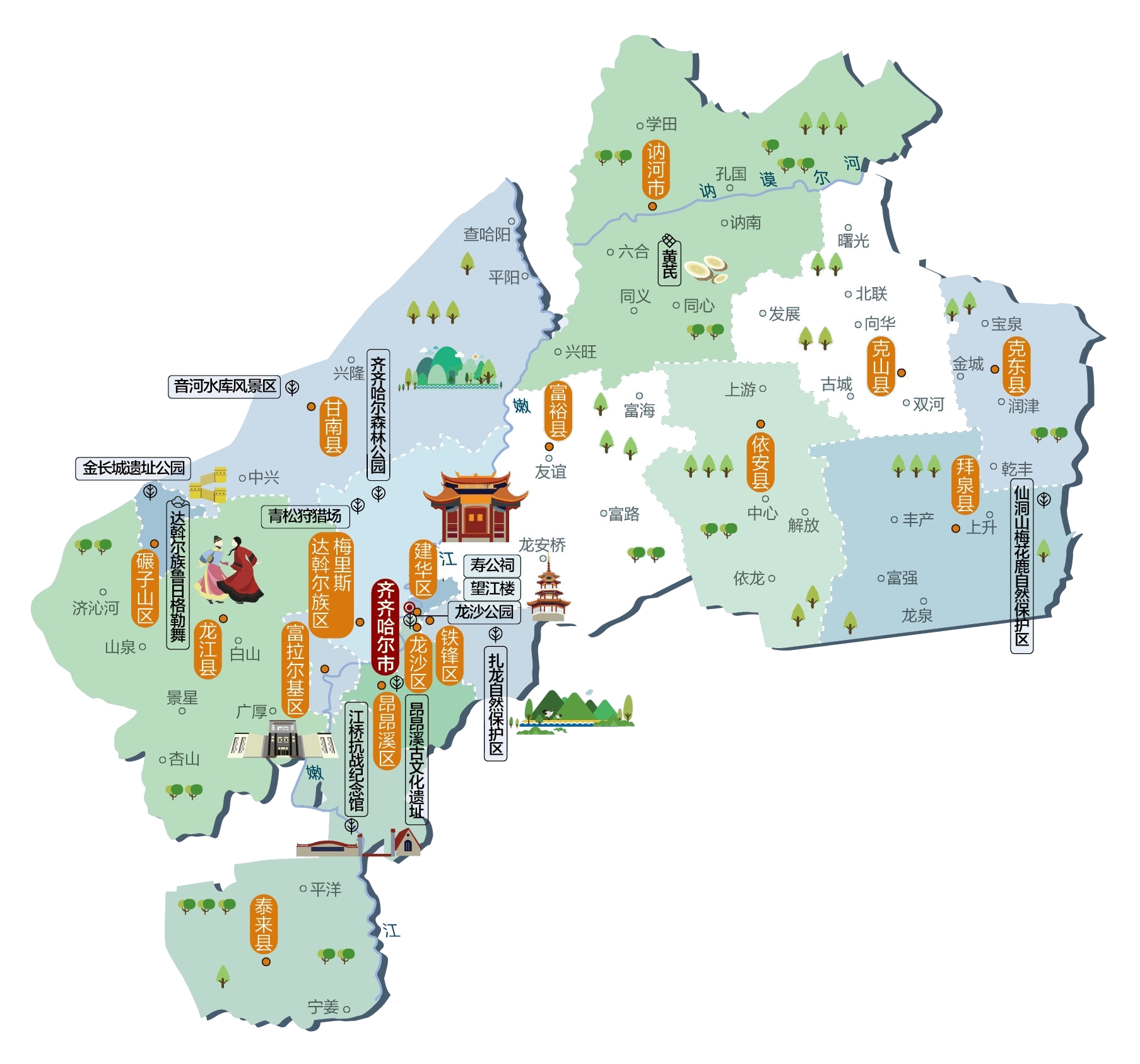齐齐哈尔市,别称鹤城、卜奎,黑龙江省辖地级市,地处中国东北地区,东北松嫩平原,在黑龙江、吉林、内蒙齐齐哈尔市现辖7个市辖区、8个县,代管1个县级市。 市辖区:龙沙区、建华区、铁锋区、昂昂溪区、富拉尔基区、碾子山区、梅里斯达斡尔族区 县级市:讷河市 县:龙江县、依安县、泰来县、甘南县、富裕县、克山县、克东县、拜泉县三省区交汇处,东临大庆市和绥化市,南接吉林省白城市,西靠内蒙古呼伦贝尔市、兴安盟,北与黑河市和大兴安岭地区接壤,总面积42469平方千米。民国二十五年(1936年),建立伪齐齐哈尔市公署,此为齐齐哈尔设市之始。齐齐哈尔市是国务院批复确定的中国重要的工业基地、黑龙江西部中心城市和东北地区重要的商品粮基地。是国家历史文化名城,既有昂昂溪文明,也有工业文明;既有民族民俗文化和宗教文化,也有数百年的流人故居、站人故居等流人边塞文化;既有黑龙江将军府、将军衙门、督军署等有效控制边疆的官署遗址,也有塔子城、金长城、百年中东铁路车站等历史文化遗存。齐齐哈尔扎龙自然保护区,拥有“世界大湿地、中国鹤家乡”的美誉。齐齐哈尔市现辖7个市辖区、8个县,代管1个县级市。