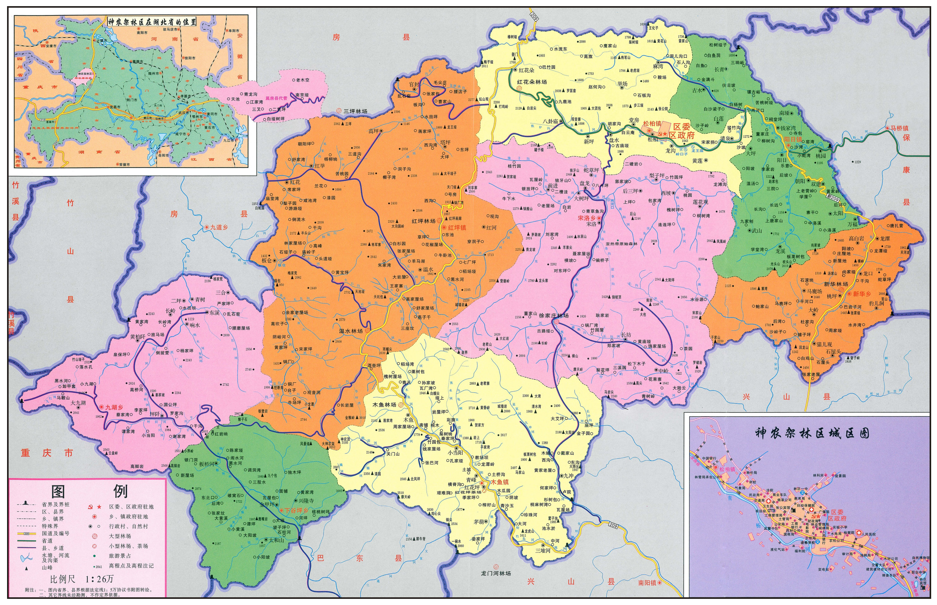 神农架林区(Shennongjia Forestry District),直属湖北省管辖,是中国唯一以林区命名的行政区,为副厅级建制。 地处湖北省西北部,西与重庆市巫山县、巫溪县相邻,北接竹山县、房县,东连保康县,南濒兴山县、巴东县,总面积3253平方公里。神农架林区,是国家级自然保护区,是保存完好的原始林区和重点生态功能区, 是中国首个获得联合国教科文组织人与生物圈自然保护区、世界地质公园、世界遗产三大保护制度共同录入的“三冠王”名录遗产地。神农架林区共辖8个乡级行政区,包括5个镇、2个乡、1个民族乡,分别是松柏镇、阳日镇、木鱼镇、红坪镇、新华镇、宋洛乡、九湖乡、下谷坪土家族乡。