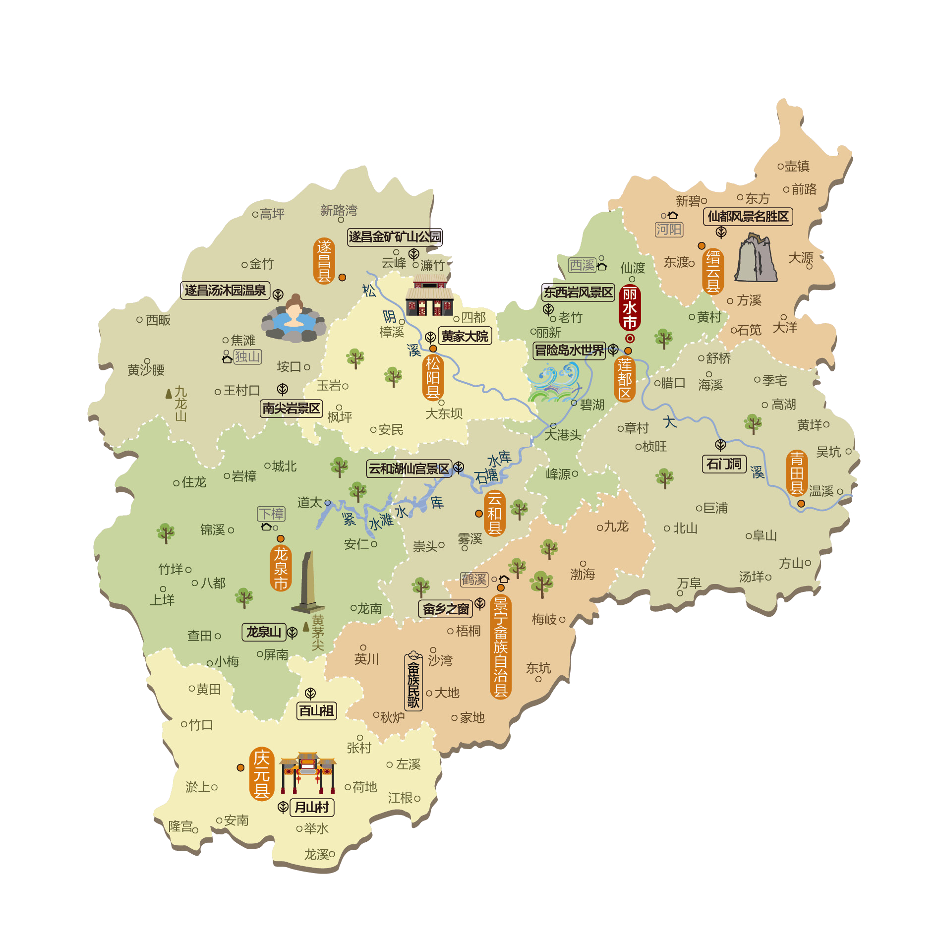 丽水市,古称处州,是中华人民共和国浙江省下辖的地级市,位于浙江省西南部,2019年被纳入长三角一体化规划。市境西北接衢州市,北界金华市,东北临台州市,东邻温州市,南抵福建省宁德市,西南靠福建省南平市。地处浙南山地丘陵区,地势西南高,东北低。西北有仙霞岭,南部有洞宫山,东北有括苍山。主要河流有属瓯江上游的大溪、小溪、龙泉溪等,并有紧水滩、滩坑等大型水库,市人民政府驻莲都区花园路1号。 丽水市是全国文明城市、国家级生态示范区、国家级生态保护与建设示范区、中国优秀旅游城市、中国优秀生态旅游城市、浙江省森林城市、浙江高质量发展建设共同富裕示范区首批试点之一。丽水市现辖1个市辖区、6个县、1个自治县,代管1个县级市。丽水是浙江省省唯一所有县(市、区)都是革命老根据地的设区市。 市辖区:莲都区 县级市:龙泉市 县:青田县、缙云县、遂昌县、松阳县、云和县、庆元县 自治县:景宁畲族自治县