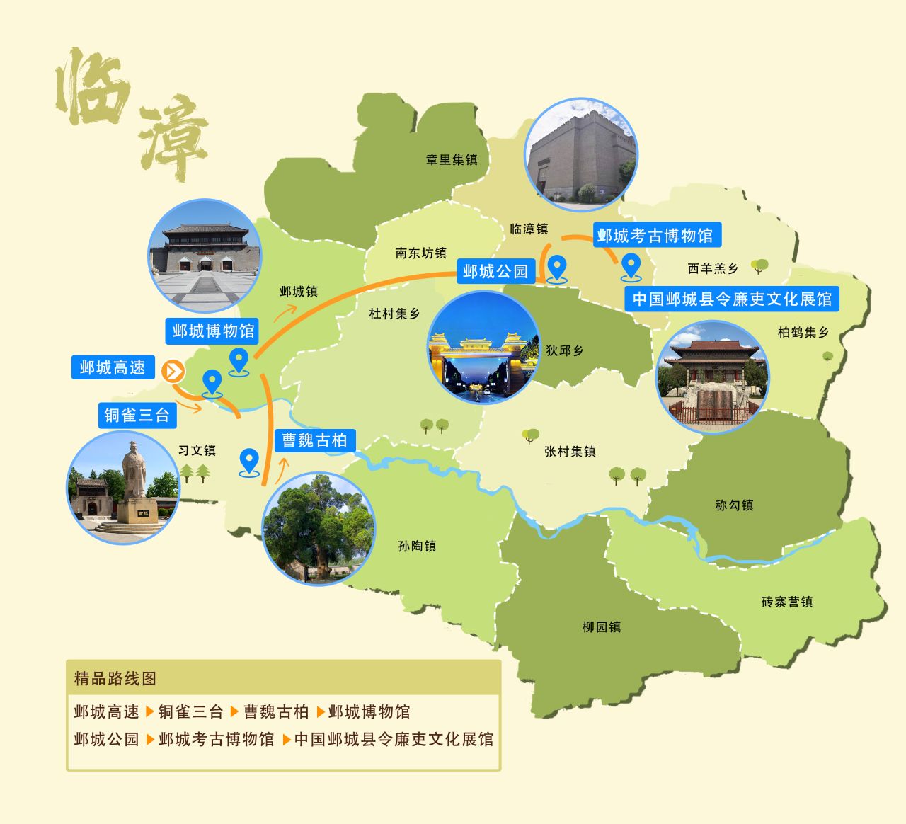 临漳县,隶属于河北省邯郸市,古时称邺,地处河北省最南端,位居中原腹部,西望太行山,东眺齐鲁地,南与河南省安阳市毗邻,素有“天下之腰脊、中原之噤喉”之称誉。河北省南部重要节点城市,邯郸都市圈的重要卫星城,宜居、宜游、宜业的历史文化古都,以现代生态农业、现代装备制造业、文化旅游业为支撑的产城融合示范区。 气候属暖温带半干旱半湿润大陆性季风气候,属漳河冲积扇平原,地势自西向东缓缓倾斜,总面积752平方千米 。临漳素有“三国故地、六朝古都”之美誉,西晋为避愍帝司马邺讳,因北临漳河将邺城易名“临漳”。三国两晋南北朝时期,邺城作为曹魏、后赵、冉魏、前燕、东魏、北齐六朝都城,居中国北方政治、经济、文化、军事中心长达四个世纪之久,是都城规划肇始地,建安文学发祥地,佛学弘传中兴地。临漳县下辖7个镇、7个乡: 临漳镇、南东坊镇、孙陶集镇、柳园镇、称勾集镇、邺城镇、章里集镇、张村集镇、砖寨营镇、习文镇、狄邱乡、西羊羔乡、杜村集乡和柏鹤集乡。