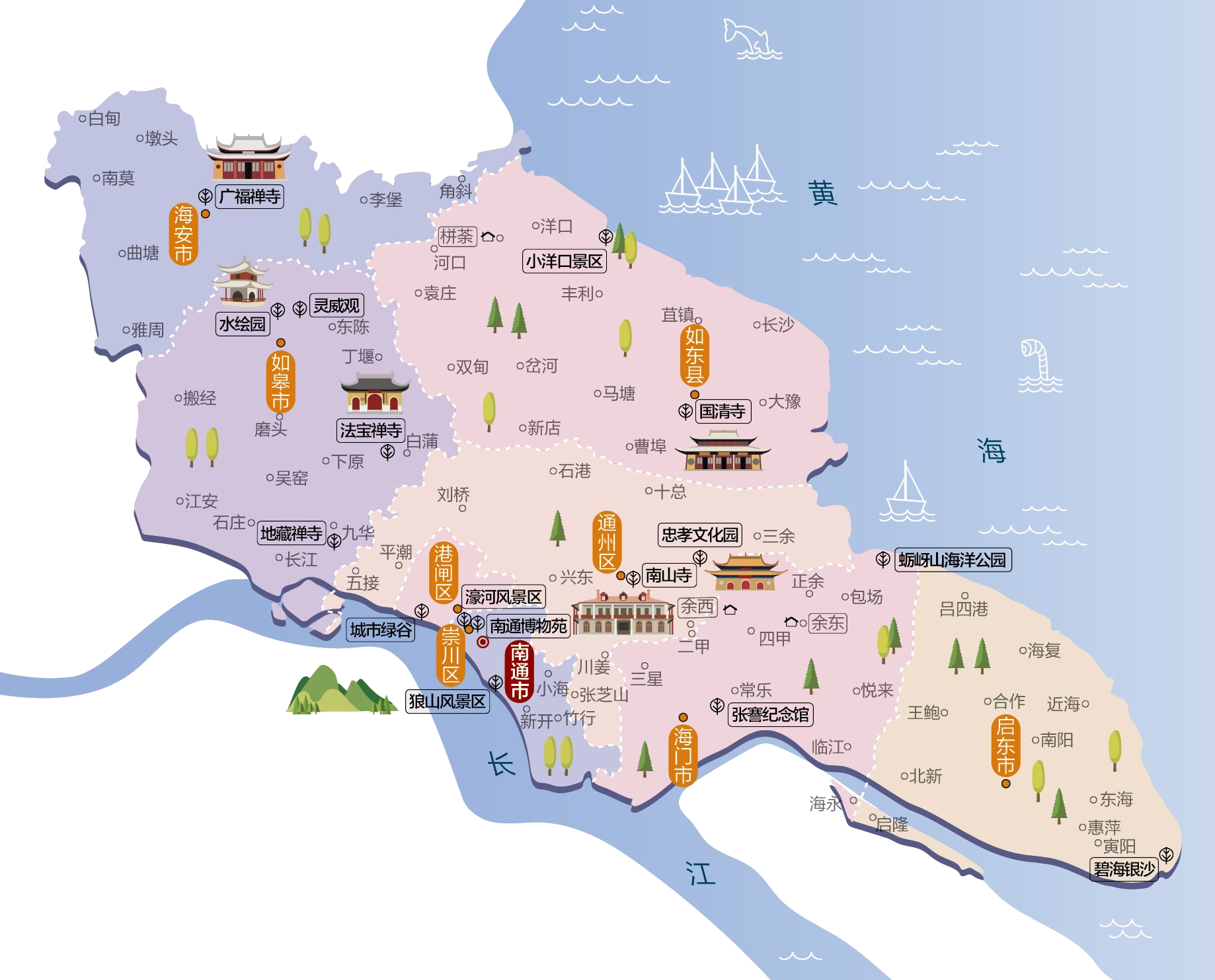 南通市,简称通,古称静海、通州、紫琅,是中华人民共和国江苏省下辖的地级市、中华人民共和国国务院批复确定的中国长三角北翼经济中心、现代化港口城市。市人民政府駐崇川区世纪大道6号。 南通地处中国华东地区、江苏东南部,为沿海城市之一。东抵黄海、南濒长江,是扬子江城市群的重要组成部分、上海大都市圈北翼门户城市、中国首批对外14个的沿海开放城市之一 ,集“黄金海岸”与“黄金水道”优势于一身,拥有长江岸线226千米,“据江海之会、扼南北之喉 ” 。南通市现辖3个市辖区、1个县,代管3个县级市。 市辖区:崇川区、通州区、海门区 县级市:启东市、如皋市、海安市 县:如东县 此外,南通经济技术开发区是由中华人民共和国国务院于1984年设立的首批国家级经济技术开发区,为南通市区重要功能区。