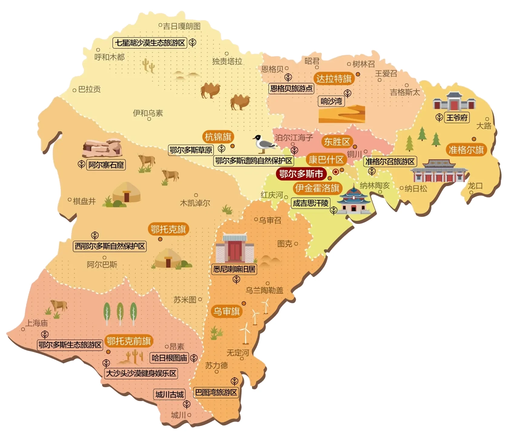 鄂尔多斯市(蒙古语:ᠣᠷᠳᠣᠰ ᠬᠣᠲᠠ,汉语拼音字母:Ôrdôs hôt)是中华人民共和国内蒙古自治区下辖的地级市,位于内蒙古自治区西南部,前身为伊克昭盟(蒙古语:ᠶᠡᠬᠡ ᠵᠤᠤ ᠠᠶᠢᠮᠠᠭ,汉语拼音字母:Ih Jûû Aimag)。市境东临呼和浩特市、山西省忻州市,南邻陕西省榆林市、宁夏吴忠市,西界阿拉善盟、乌海市、宁夏石嘴山市、银川市,北接包头市、巴彦淖尔市。地处鄂尔多斯高原,西北部为库布其沙漠,南部为毛乌素沙漠,东部为丘陵沟壑,北部为黄河冲积平原。黄河环绕市境东、北、西三面边界。全市汉族人口占90%,蒙古族人口占9%。“鄂尔多斯”之名来自所处的鄂尔多斯高原,可追溯蒙古部落——鄂尔多斯部,为蒙古语“众多的宫帐”之意。市人民政府驻市府南街。 鄂尔多斯煤炭资源丰富,全市约八成面积蕴含煤炭,石油、天然气、稀土等储量亦丰,自上世纪末得到开发以来,经济总量一直迅速攀升,因其强劲的经济发展势头而闻名。鄂尔多斯市现辖2个市辖区、7个旗。 市辖区:东胜区、康巴什区 旗:达拉特旗、准格尔旗、鄂托克前旗、鄂托克旗、杭锦旗、乌审旗、伊金霍洛旗