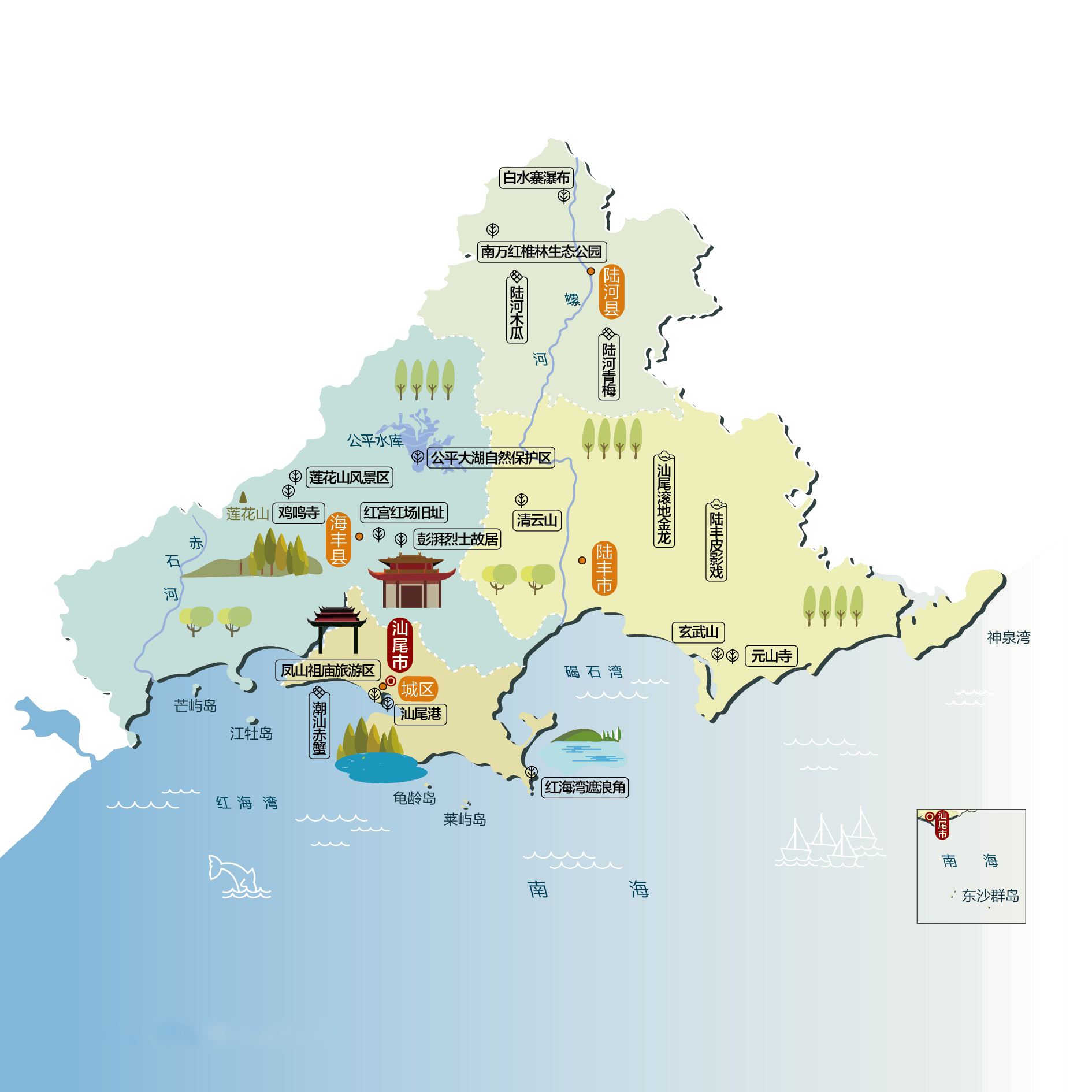 汕尾市,是中华人民共和国广东省下辖的地级市,通称海陆丰,位于广东省东南部,南濒南海。市境东邻揭阳市,北临梅州市、河源市,西界惠州市。地处珠江三角洲与粤东沿海丘陵区的结合部,东距汕头市160公里,西距深圳市120公里。地势西北高,东南低,西北有莲花山脉,东南为低山丘陵和滨海平原。螺河、黄江等从北向南流入南海,海岸线约455公里,拥有沿海大小岛屿881个。市人民政府驻城区汕尾大道429号。 汕尾市下辖1个市辖区、2个县,代管1个县级市。 市辖区:城区 县级市:陆丰市 县:海丰县、陆河县