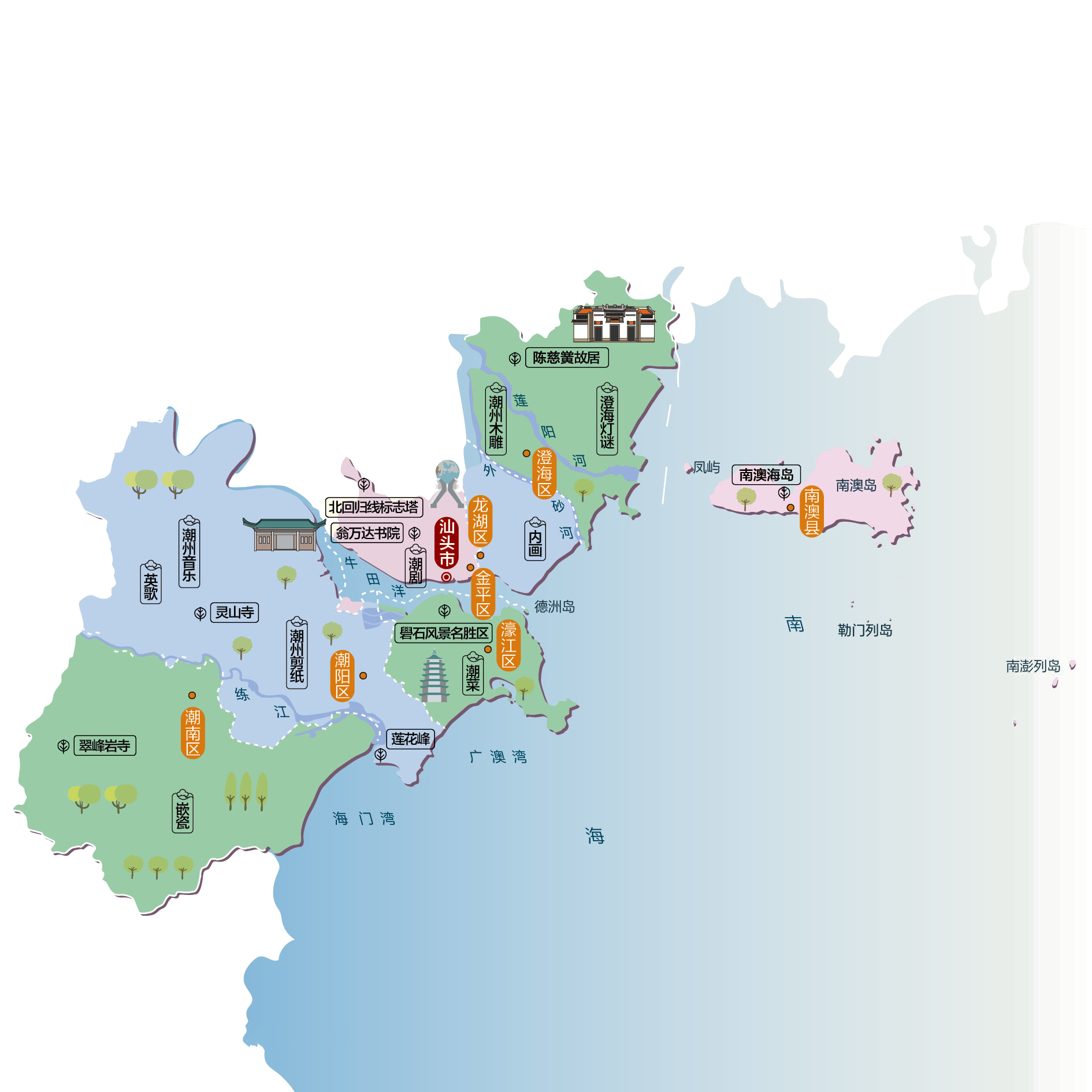 汕头市,简称汕,别称?城,是中华人民共和国广东省下辖的地级市,国务院以《立法法》确立的经济特区、海峡西岸经济区中心城市之一、21世纪海上丝绸之路重要门户、粤东中心城市和东南沿海重要港口城市,广东省域副中心城市,位于广东省东部,市境西邻揭阳市,北接潮州市,东隔台湾海峡与台湾相望,南滨南海、地处莲花山脉东南麓,韩江三角洲平原,韩江、榕江、练江的入海口,东部为广东省最大岛屿南澳岛、市政府驻跃进路28号。 汕头市现辖6个市辖区、1个县,其中金平区、龙湖区、濠江区三区为中心城区。 市辖区:龙湖区、金平区、濠江区、潮阳区、潮南区、澄海区 县:南澳县