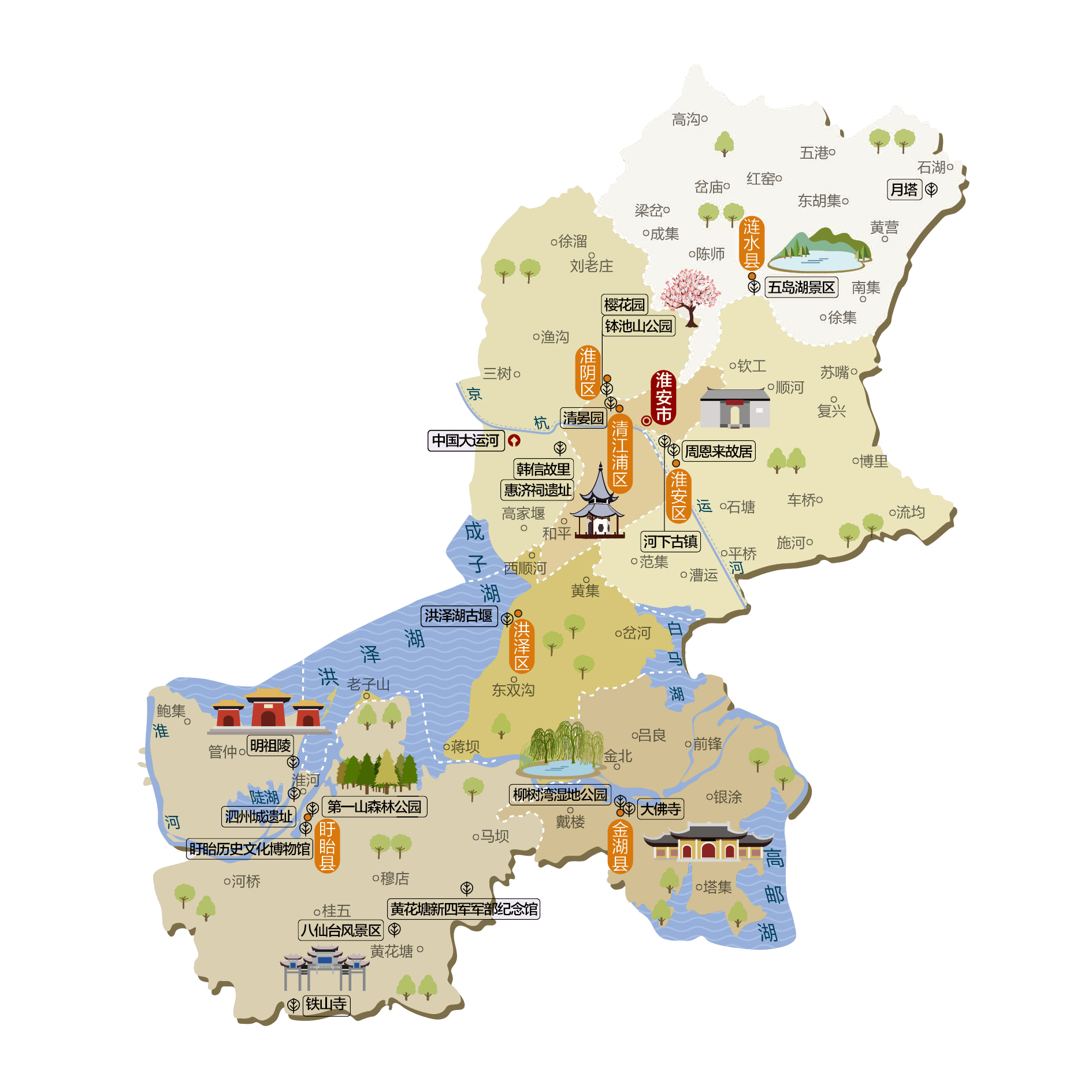 淮安市,简称淮,旧称淮阴,古称淮州、楚州、山阳、东阳,是中华人民共和国江苏省下辖的地级市,2019年正式被列入长三角一体化规划,位于江苏省中偏北部。市境西北临宿迁市,东北界连云港市,东达盐城市,东南接扬州市,西南邻安徽省滁州市。地处长江中下游平原的江淮平原里下河平原腹地,地势平坦,西南部地势较高,有少量丘陵岗地。境内河湖水网交错,西南有洪泽湖,东南有高邮湖。京杭运河贯穿市区,苏北灌溉总渠、淮河、里运河等流经境内,并建有三河闸、高良涧进水闸等水利枢纽。淮安市下辖4个市辖区、3个县。 市辖区:清江浦区、淮安区、淮阴区、洪泽区 县:涟水县、盱眙县、金湖县