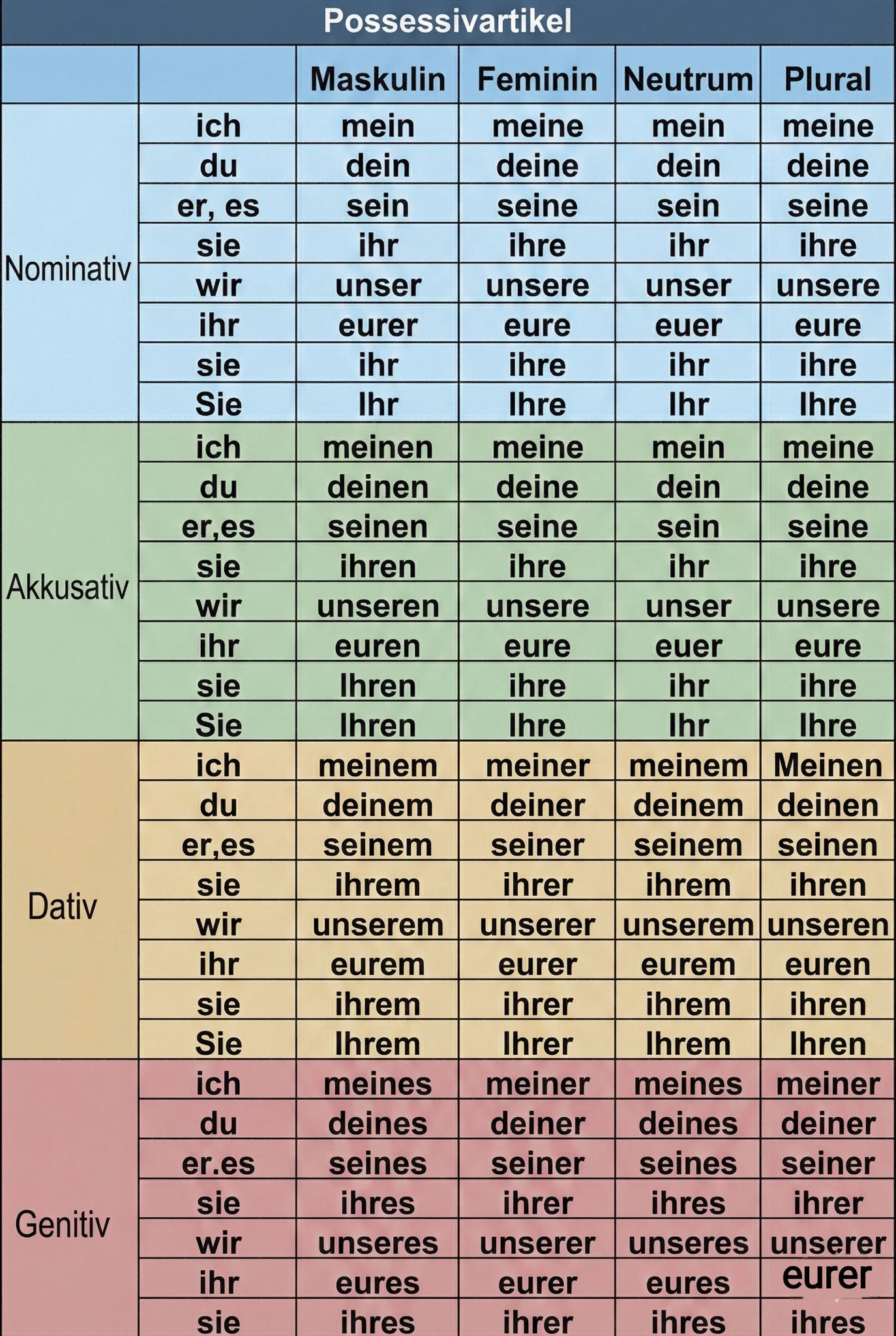 Possessivartikel (mein, dein, sein, ihr, unser, euer, ihr/Ihr) bezeichnen im Deutschen Besitz oder Zugehörigkeit und begleiten ein Nomen. Sie stehen vor dem Substantiv und werden dessen Genus, Numerus und Kasus angepasst (dekliniert). Im Singular folgen sie den Endungen des unbestimmten Artikels („ein“), im Plural denen des bestimmten Artikels.