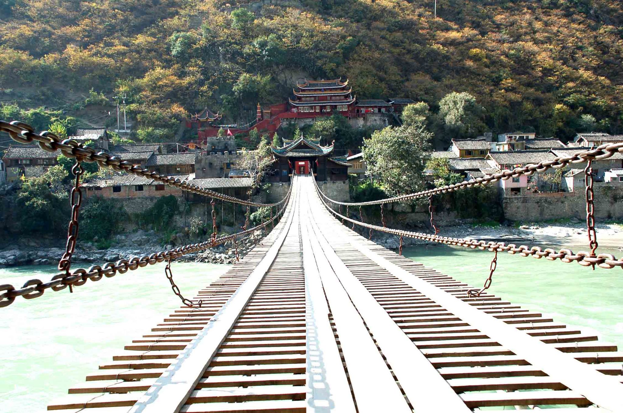 泸定桥,又称大渡桥,位于中国四川省西部的大渡河上,是一座由清朝康熙帝御批建造的悬索桥。始建于清康熙44年(1705年),建成于康熙45年(1706年)。
