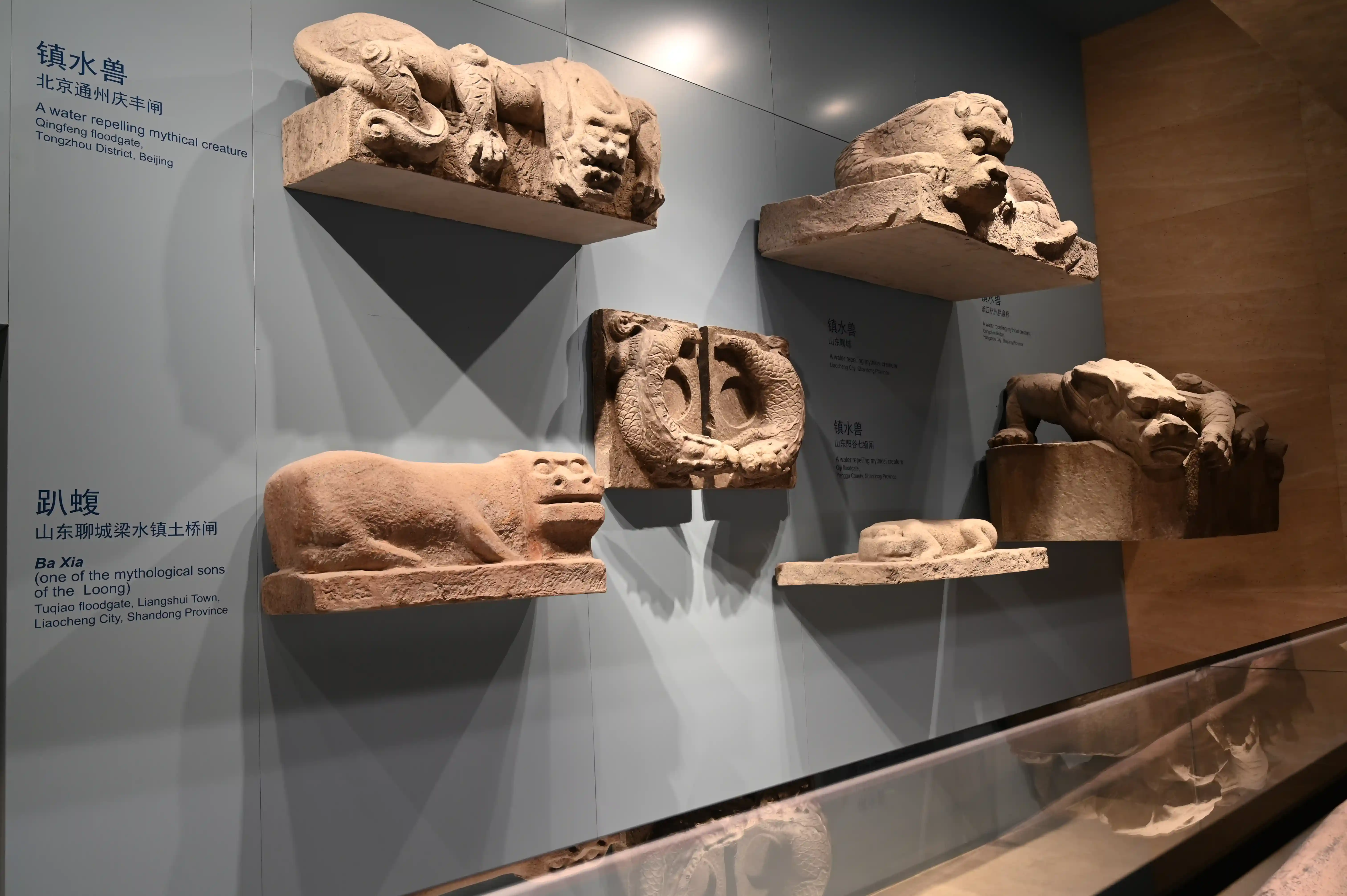 镇水兽是中国古代水利设施(如桥梁、堤岸)上雕刻或铸造的瑞兽,寓意镇压水患、保佑安澜,主要形象有龙、牛、犀牛、蚣蝮(或称趴蝮)等,它们结合了中国古代对水患的敬畏与大禹治水、李冰开凿都江堰等神话传说,是兼具实用性(如测量水位)与装饰性的文化符号。 牛 (Copper/Iron Ox):基于五行“土克水”的观念,也因其力大识水性,常被铸成铁牛或铜牛放置于河边,如颐和园的铜牛、江陵的铁牛。 犀牛 (Stone Rhinoceros):与李冰“五犀牛”传说相关,古蜀人认为犀牛能辟水,是早期镇水神兽,如成都博物馆的石犀。 蚣蝮 (Gongfu):龙的九子之一,喜水,身有龙鳞,头有犄角,擅长吃水妖,常雕刻在建筑排水口或桥梁上。 趴蝮 (Baxia):与蚣蝮相似,也是龙九子之一,喜水,是万宁桥下的镇水兽,通常成对出现,有测量水位的功能。