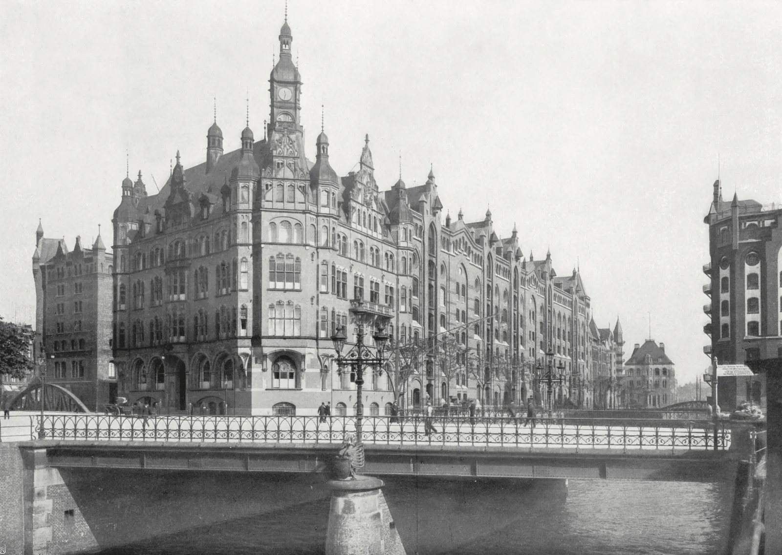 Die Freie und Hansestadt Hamburg gründete im März 1885 die Freihafen-Lagerhaus-Gesellschaft, Vorgängerin der HHLA. Sie sollte im Zuge des Zollanschlusses an das Deutsche Kaiserreich den Bau der Hamburger Speicherstadt realisieren und später das Logistikzentrum im Hafen verwalten. Das Bild stammt aus der Zeit um 1910.
