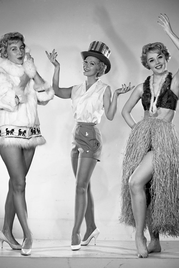 1959 Alaska wird am 3. Januar und Hawaii am 21. August zu einem Bundesstaat. Um diese Ereignisse zu feiern, huldigen die Models den neuen Bundesstaaten in ihren Kostümen zusammen mit "Uncle Sam". Quelle:GETTY IMAGES