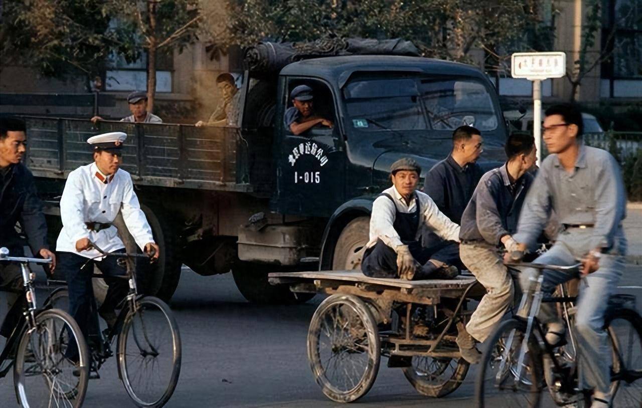 这是北京1980年的一张街头照片,一名工人正在一辆三轮自行车上和一名同事一起工作。在他的后面,是北京交通局的货车。