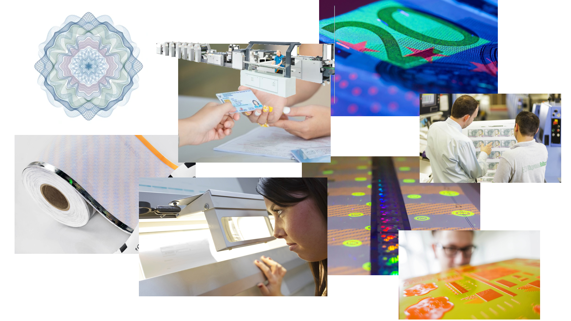 Typische Produkte einer Sicherheitsdruckerei sind Ausweise, Banknoten, Aktien, aber auch Eintrittskarten, Gutscheine oder Landkarten. Je nach Schutzwürdigkeit des Druckgutes kommen dabei verschiedene Technologien zum Einsatz: Mikroschrift Stahlstich bzw. Intagliodruck Aufbringen von Folien und Hologrammen Barcodes und Zahlenkombinationen Guillochen, insbesondere beim Druck von Banknoten und Wertpapieren Irisdruck Neben diesen Drucktechniken werden Sicherheitsmerkmale im Papier eingearbeitet, b