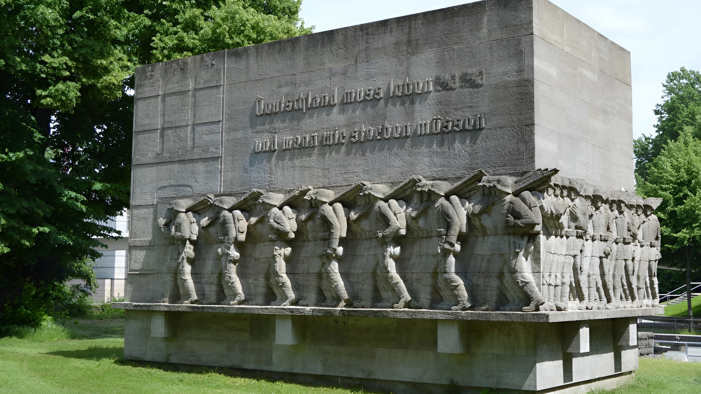 Die Inschrift auf der Parkseite „Deutschland muss leben und wenn wir sterben müssen“ macht den historischen Kontext deutlich. Du stehst keinem idyllischen Mahnmal gegenüber, sondern einem Zeitzeugnis, das bewusst hervorragt und nachdenklich stimmt. Der sieben Meter hohe Block aus Muschelkalk entstand 1936 nach dem Entwurf von Richard Kuöhl und wurde vom Infanterie-Regiment Hamburg Nr. 76 initiiert. Er trägt ein umlaufendes Relief mit insgesamt 88 lebensgroßen Soldaten, die mit Stahlhelm und Mars