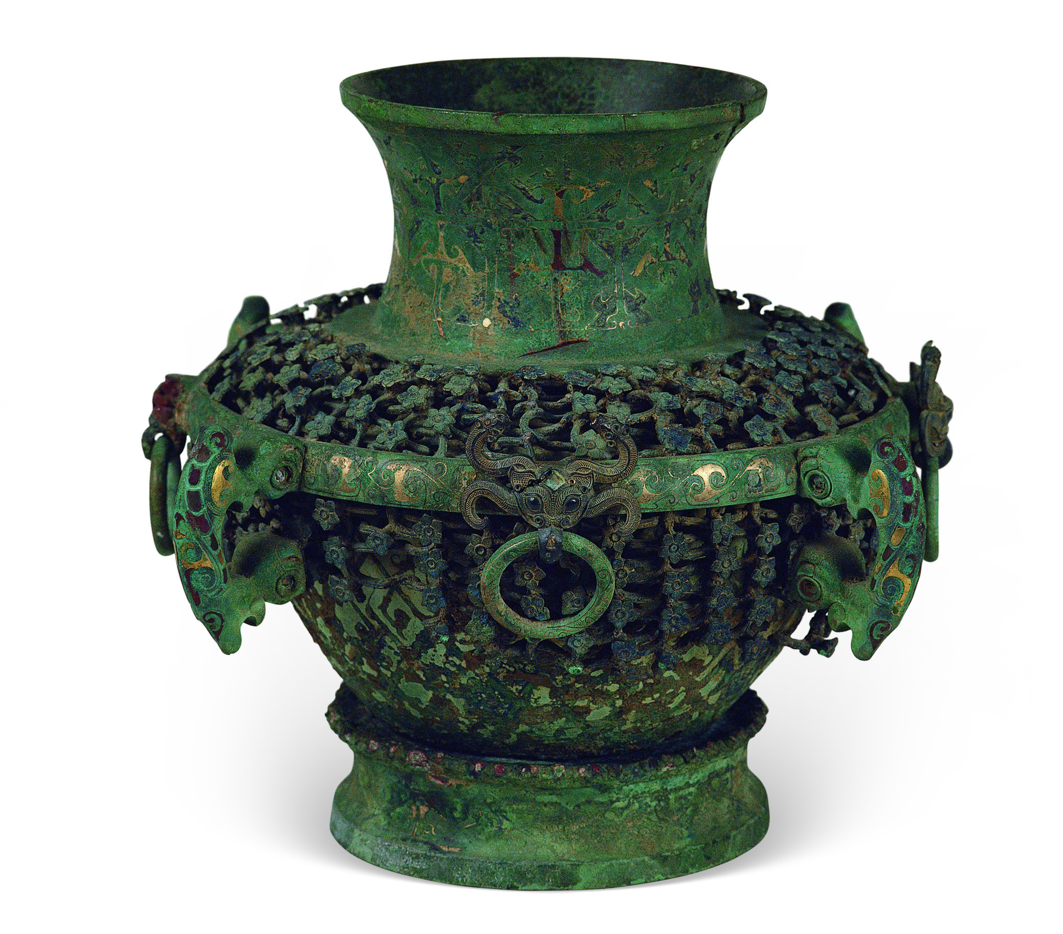 为战国时期铸造的珍贵文物。错金银重络铜壶重量为5590g,高23.6厘米,口径12.8厘米,腹径22.2厘米,圈足径13.8厘米。壶体除了颈部与腹部的错金银斜方格云纹外,还各有48条蟠龙和48行梅花,工艺极其繁复精致。壶身网格套外还有四只伏兽和四个衔环兽首。