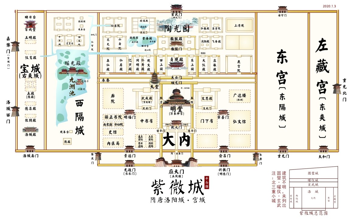 简介:隋洛阳城分为外城、皇城(太微城)、宫城(紫微城)三重城垣。宫城名为紫微城,是隋、唐、武周帝国的大朝正宫、世界性政治中心和国家象征, 位于神都洛阳西北隅至高之处,前后沿用530余年,成为九朝理政之所。是中国历史上沿用时间最长、使用朝代最多的皇宫。面积:紫微城东西2100米,南北1840—2160米,占地面积约4.2平方公里,是明清北京紫禁城的6倍,唐大明宫的1.3倍,被誉为“万宫之宫”。