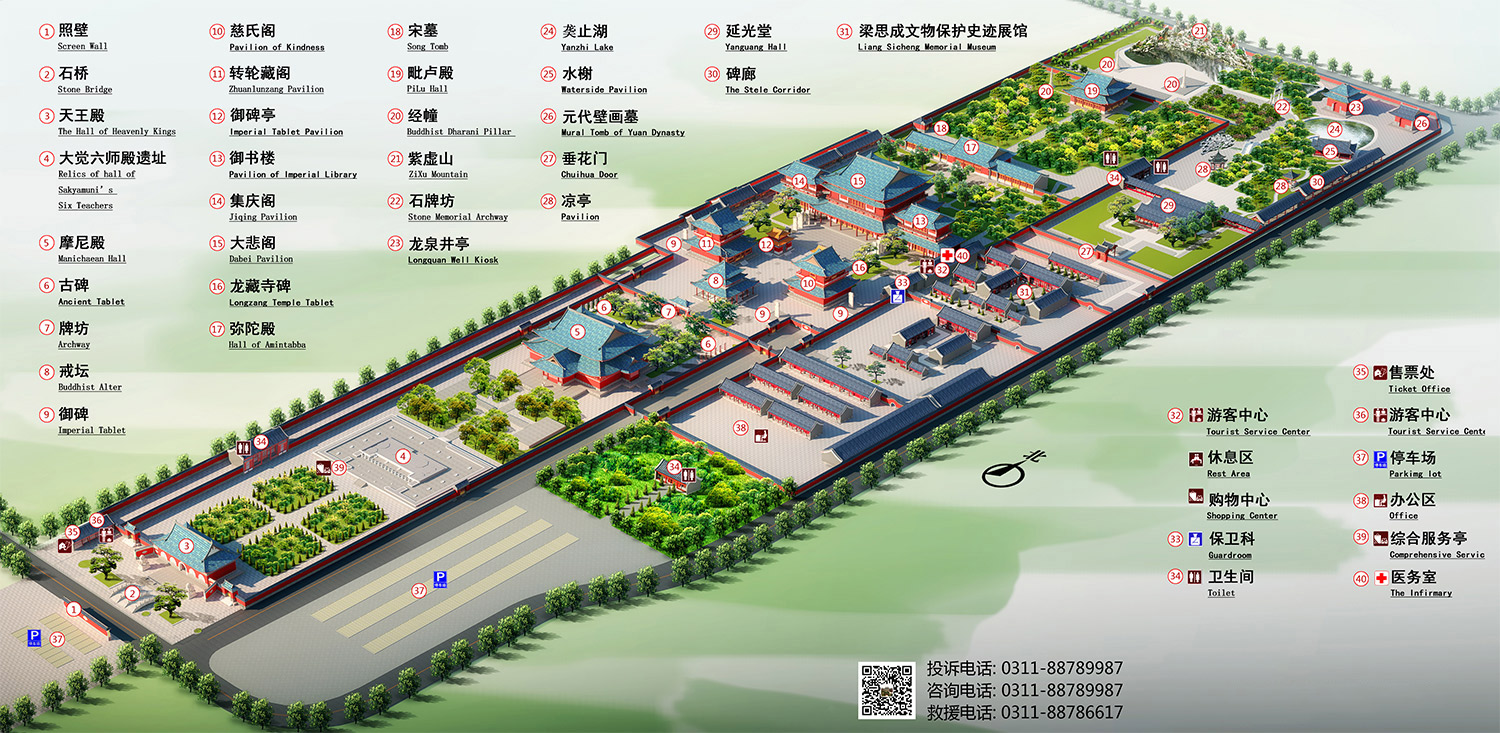 Der neue Tempel wurde erst im Jahre 1994 aufgebaut. Drei Jahren später entstand die weltgrößte freistehende Bronzestatue des Buddha Sakyamuni, die 88 Meter hoch aufragt. In der Nähe wurde 2006 der prächtige "Fangong", der Brahma Palast, fertig gestellt, den 60 Buddhisten, Architekten und Künstlern aus unterschiedlichen Teilen Chinas gemeinsam geplant haben. Das Bauwerk liegt auf der Südnord-Achse des Geländes und hat eine nützliche Fläche von 70.000 Quadratmetern. In dem dreistöckigen Gebäude werden viele Schätze und Kunstwerke aufbewahrt. Somit bezeichnen manche den Palast als "buddhistischen Louvre" des Ostens.(Quelle:http://german.china.org.cn)