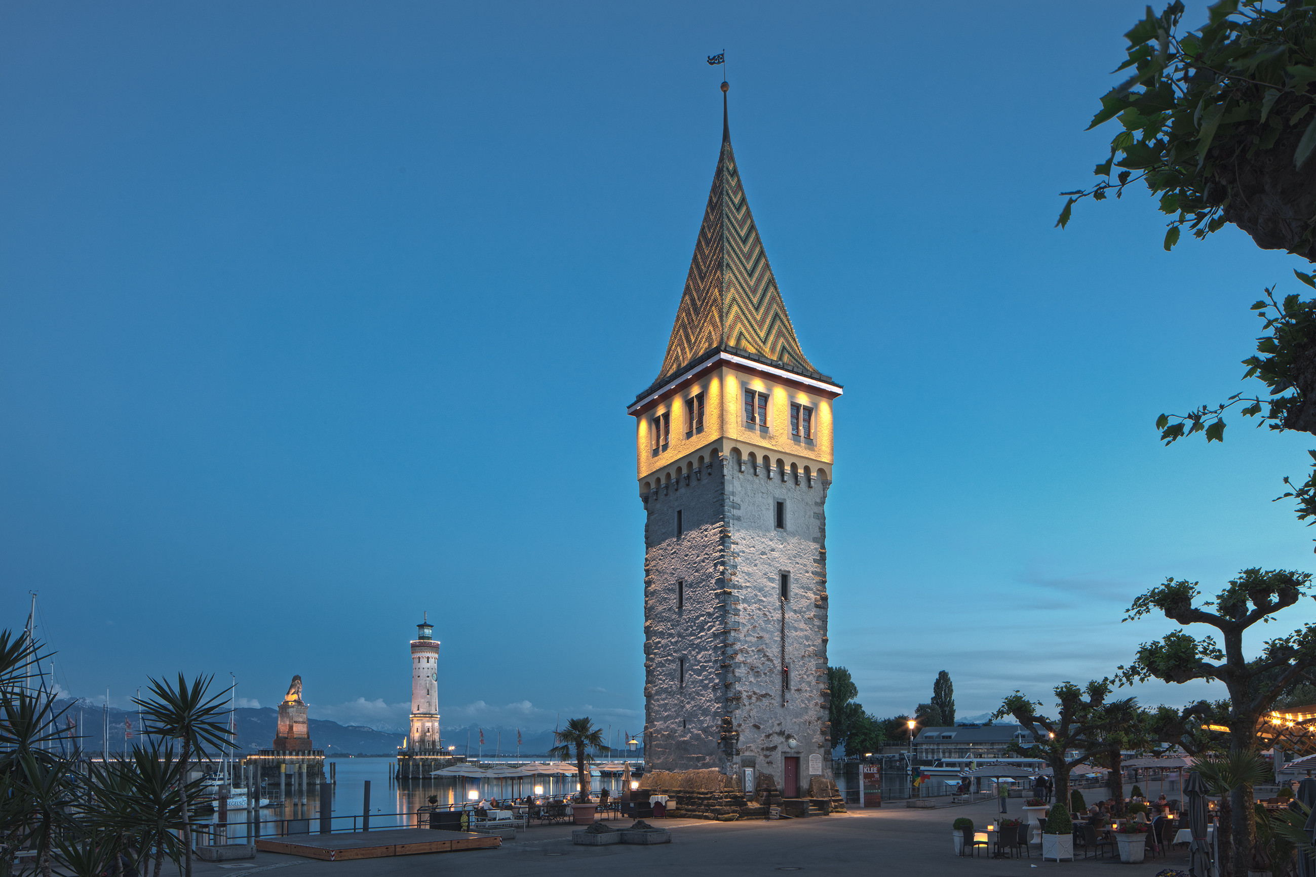 这座方形石头建筑建于 12 世纪,是中世纪城镇防御工事的一部分。塔楼高 20 米,配有护墙,气势宏伟,过去四面环水,只能通过吊桥进入。直到 1856 年林道的新灯塔落成,这座人塔才失去了作为信号和观察哨所的功能。灯塔被扩建了一层,并覆盖上了独特的琉璃瓦,如今它已成为广受欢迎的摄影主题。