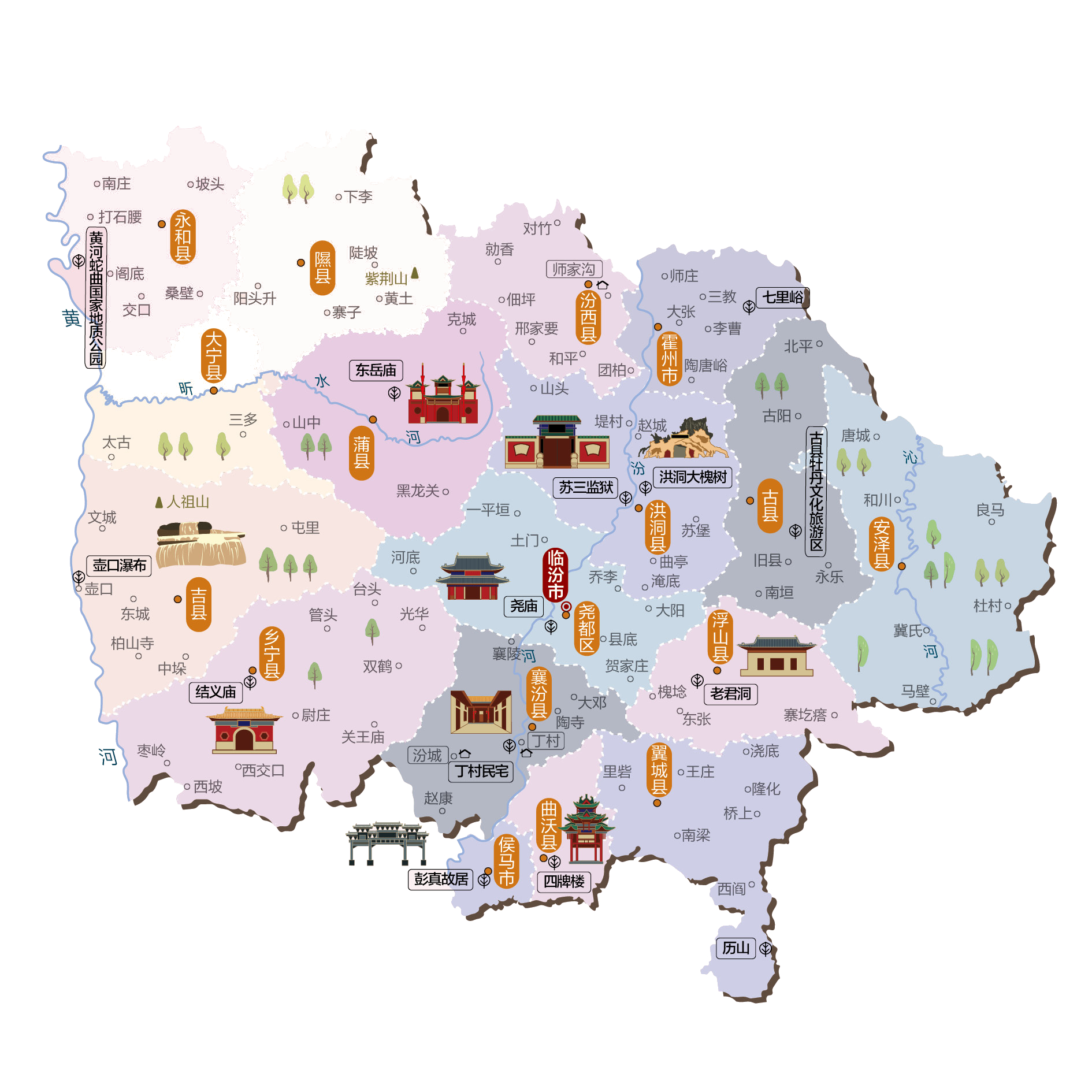 临汾市,古称平阳、晋州,是中华人民共和国山西省下辖的地级市,位于山西省西南部,黄河东岸,因濒临汾河而得名。市境南接运城市,东南邻晋城市,东北界长治市,北达晋中市、吕梁市,西隔黄河与陕西省延安市、渭南市相望。地处黄土高原东南部,东部为太岳山、中条山,中部为汾河盆地,西部为吕梁山。汾河自北向南纵贯全境,沁河流经市境东部。市人民政府驻尧都区解放路市府街。 临汾历史悠久,是华夏民族的重要发祥地和黄河文明的摇篮,有“华夏第一都”之称。临汾是华北地区重要的粮棉生产基地,盛产小麦、棉花等,素有“棉麦之乡”和“膏腴之地”美誉;该市已形成多元产业体系,是山西省新型能源和工业基地建设的重要组成部分;该市自然资源丰富,是中国三大优质主焦煤基地之一;该市非物质文化种类繁多,有蒲州梆子、威风锣鼓等多种民间艺术形式,被誉为“梅花之乡”、“剪纸之乡”和“锣鼓之乡”。